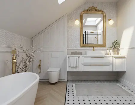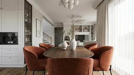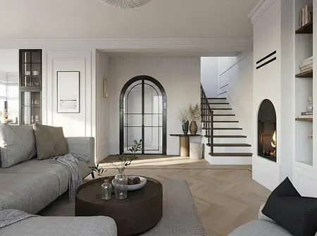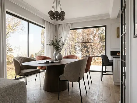 Projekt domu w Toruniu oparty na czytelnym układzie funkcjonalnym i konsekwentnej kompozycji materiałowej. Kluczowe było uporządkowanie stref dziennej i prywatnej oraz maksymalne wykorzystanie światła. Bazę stanowią naturalne materiały, ciepłe drewno i stonowana paleta barw, które budują ponadczasowy charakter wnętrza. Projekt obejmował koncepcję, wizualizacje oraz pełną dokumentację techniczną przygotowaną do realizacji.