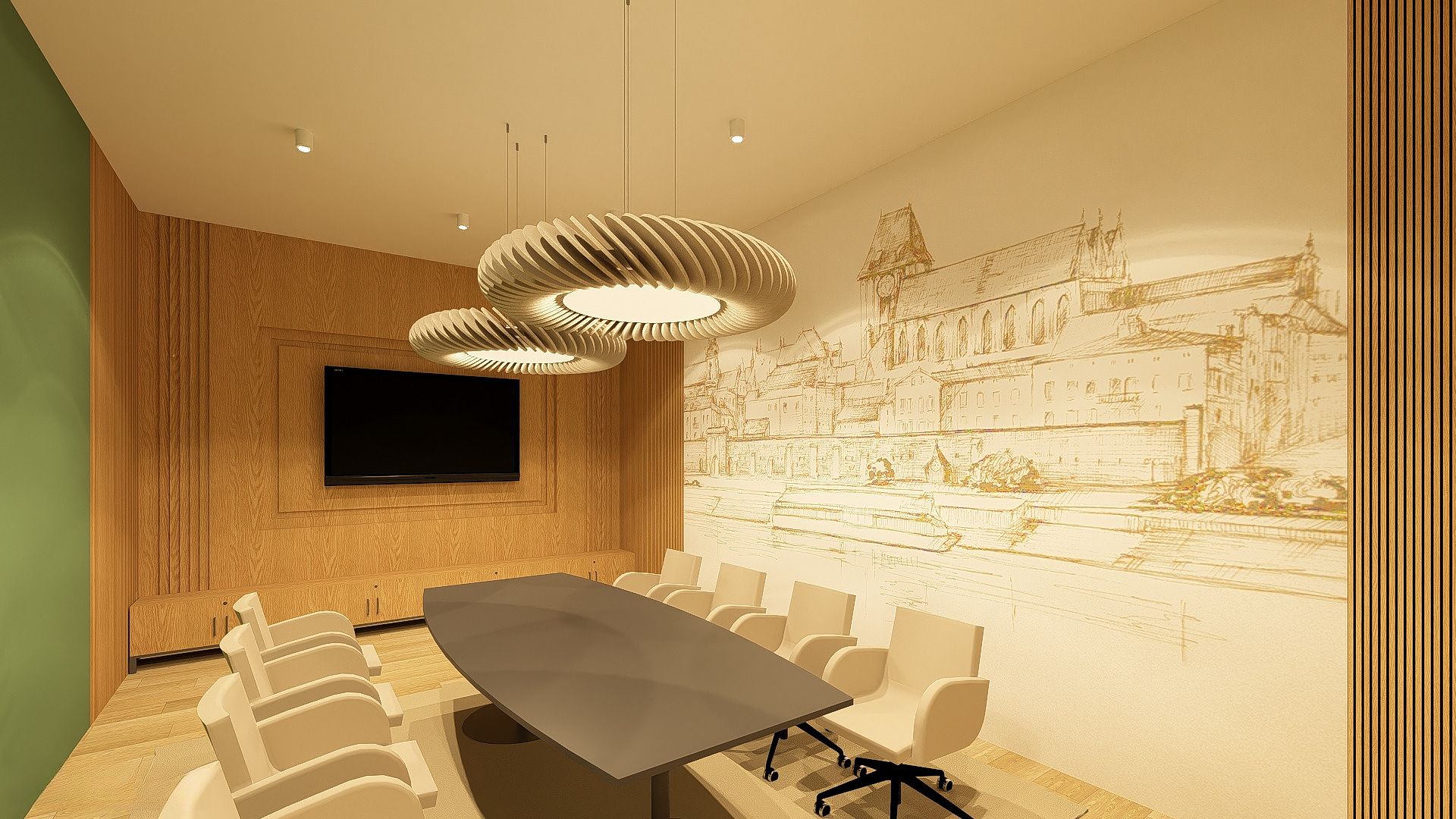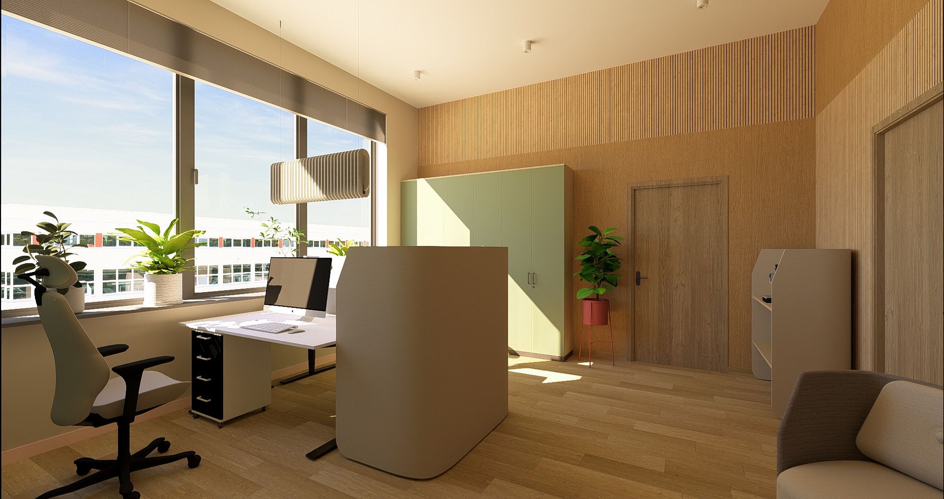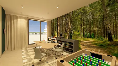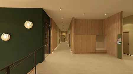 Wnętrza zostały zaaranżowane w nowoczesnym przyjaznym stylu, z wykorzystaniem ciepłych odcieni farb oraz drewna.