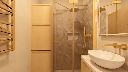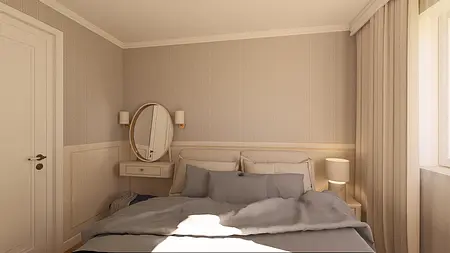 Jasne i delikatne barwy oraz lustra rozświetlają i powiększają niewielką przestrzeń, nadając jej lekkości.
