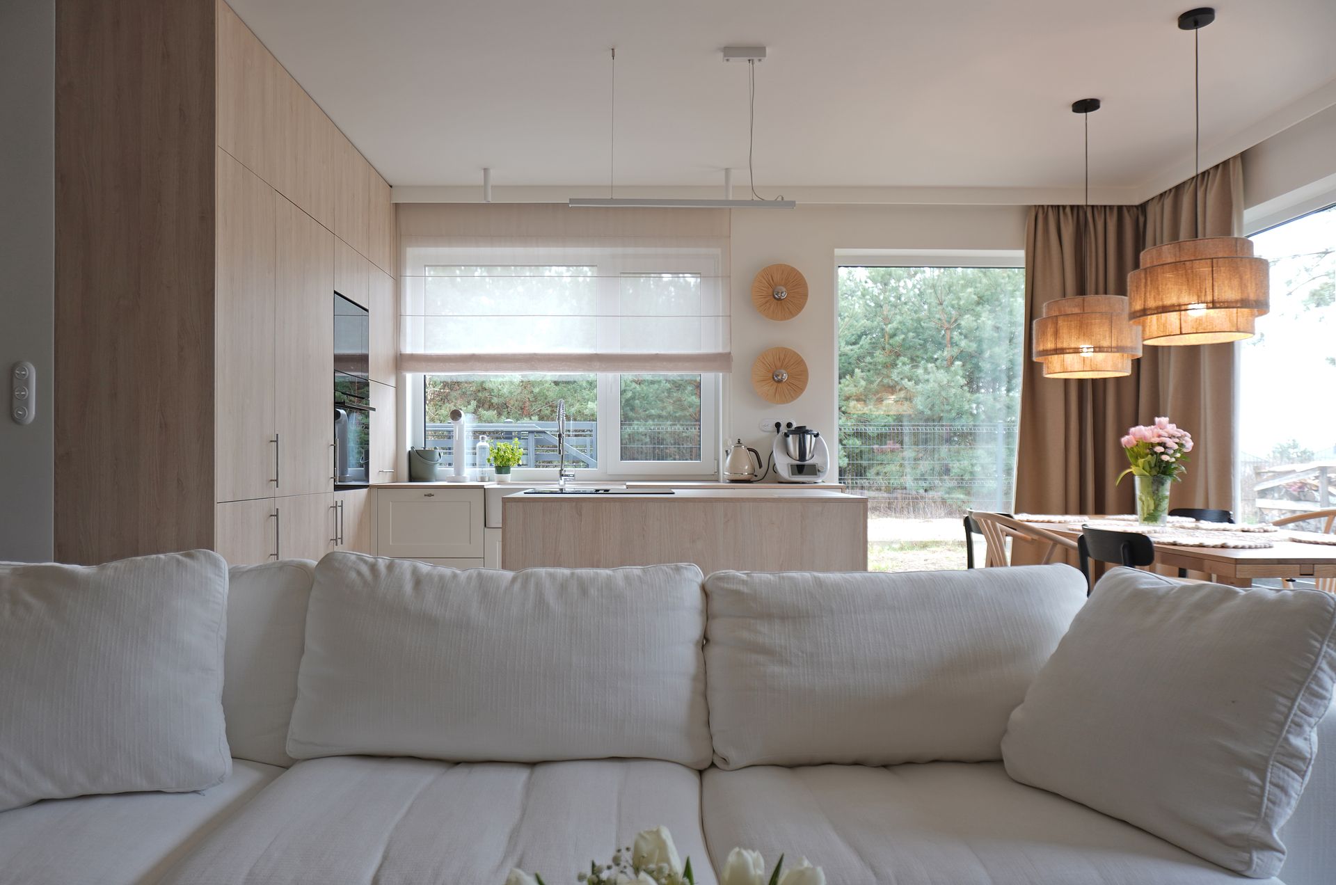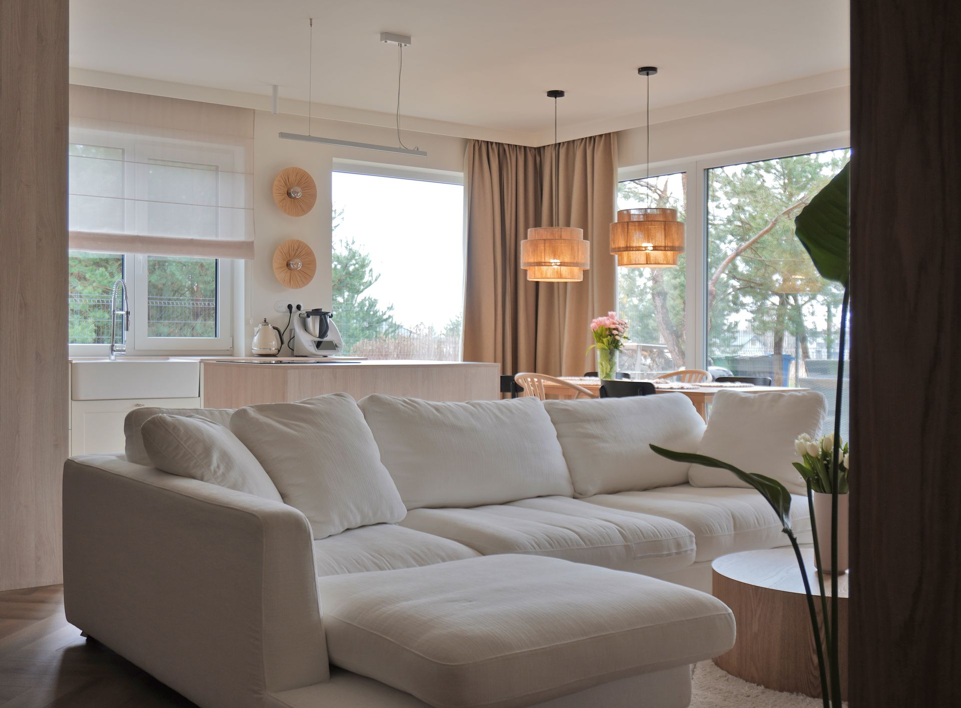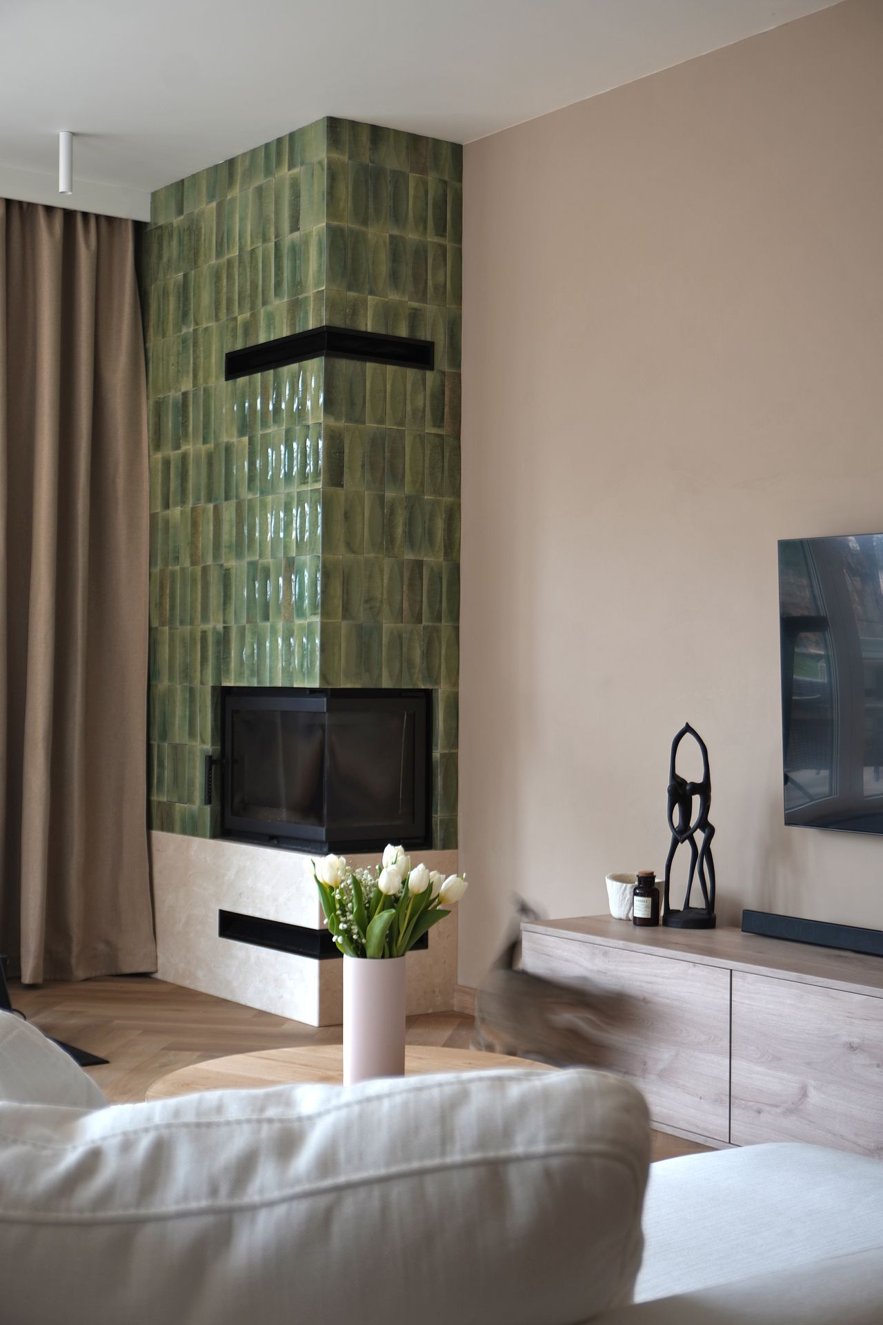 Realizacja projektu wnętrza domu pod Warszawą dla pary. Rozpoczynając pracę nad wnętrzem tego domu od razu wiedziałam, że to będzie wyjątkowy projekt. Wnętrze miało połączyć ciepło rustykalnego stylu z funkcjonalnością nowoczesnego designu. I tak powstał ten dom - pełen jasnego drewna, naturalnych materiałów i przemyślanych rozwiązań. Centralną częścią mieszkania jest narożny kominek obłożony, zieloną płytką, która przyciąga wzrok od razu po wejściu do strefy dziennej. Kominek stanowi dominantę dla całego wnętrza i odbija światło w załamaniach łezek. Projekt Zuzanna Orlińska. Projektowanie wnętrz Warszawa - Zuzanna Orlińska
