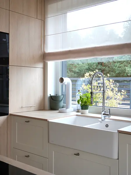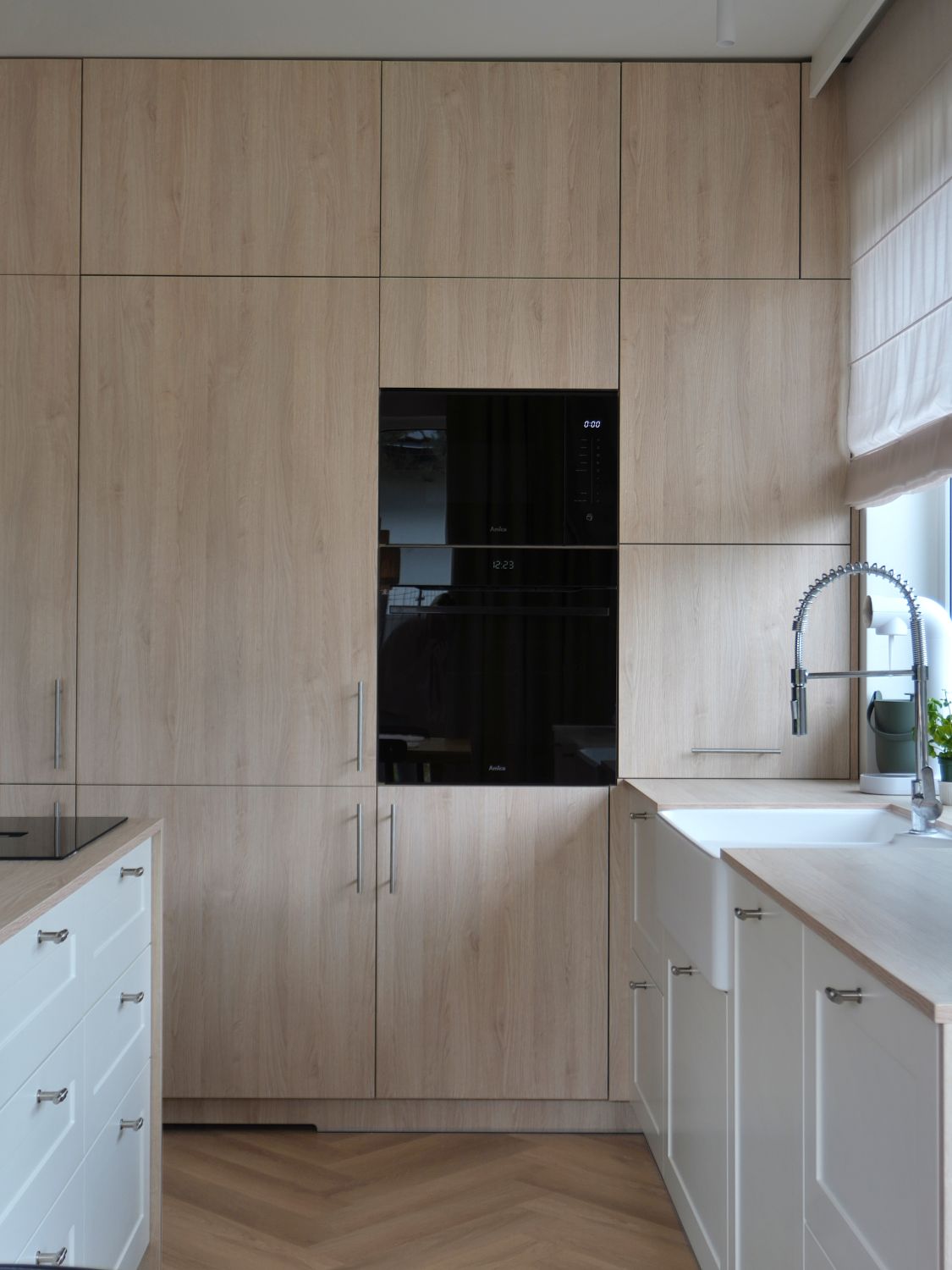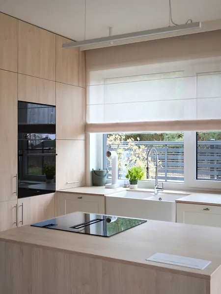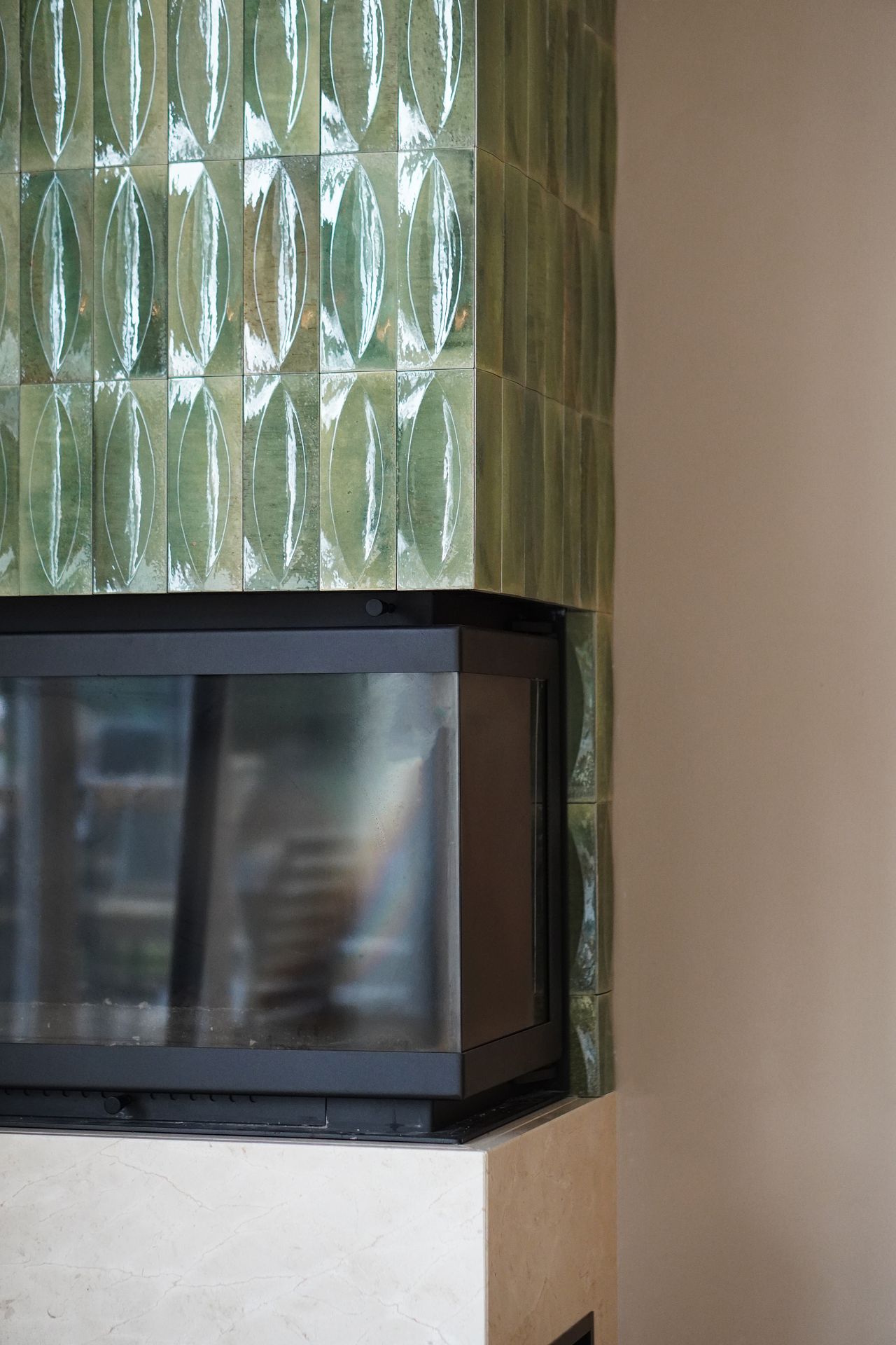 Realizacja projektu wnętrza domu pod Warszawą dla pary. Rozpoczynając pracę nad wnętrzem tego domu od razu wiedziałam, że to będzie wyjątkowy projekt. Wnętrze miało połączyć ciepło rustykalnego stylu z funkcjonalnością nowoczesnego designu. I tak powstał ten dom - pełen jasnego drewna, naturalnych materiałów i przemyślanych rozwiązań. Centralną częścią mieszkania jest narożny kominek obłożony, zieloną płytką, która przyciąga wzrok od razu po wejściu do strefy dziennej. Kominek stanowi dominantę dla całego wnętrza i odbija światło w załamaniach łezek. Projekt Zuzanna Orlińska. Projektowanie wnętrz Warszawa - Zuzanna Orlińska