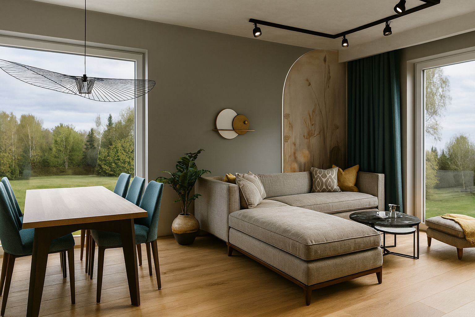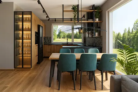 Inwestorka dobrze czuje się w stylistyce nowoczesnego wnętrza z elementami industrialnymi, ale w ciepłych i domowych klimatach.