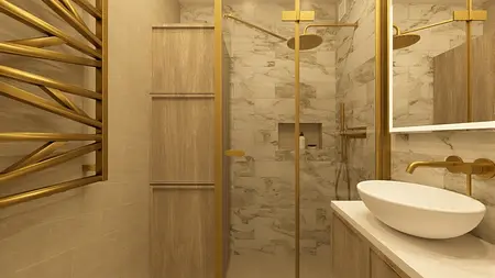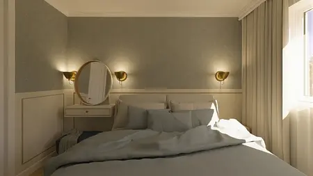 Jasne i delikatne barwy oraz lustra rozświetlają i powiększają niewielką przestrzeń, nadając jej lekkości.