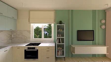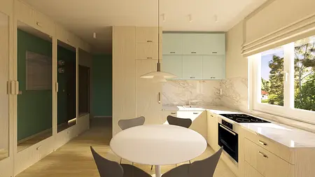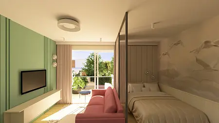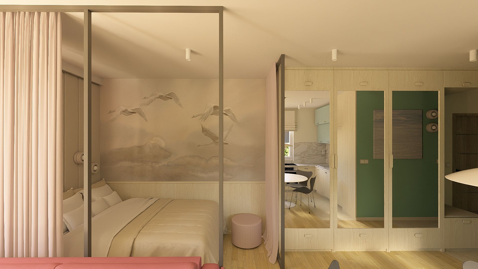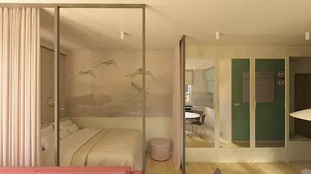 Kawalerka w pastelowych kolorach z aneksem kuchennym i wydzieloną częścią na sypialnię.