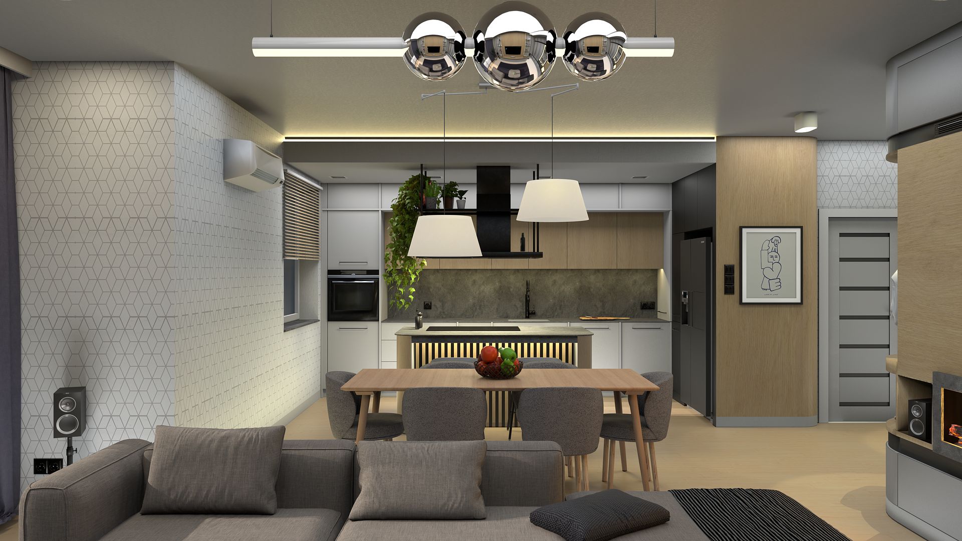 Nowoczesne wnętrze, w którym prostota spotyka się z ciepłem naturalnych materiałów. Jasna paleta barw, miękkie tkaniny i wyważone akcenty — od subtelnych wzorów na ścianach po rytmiczny układ zabudowy — nadają przestrzeni spójność i elegancję. Kuchnia, jadalnia i salon tworzą harmonijną oś kompozycyjną, gdzie każdy element ma swoje miejsce i funkcję, a całość pozostaje otwarta, lekka i pełna światła. To projekt dla tych, którzy cenią porządek, komfort i design z wyczuciem.