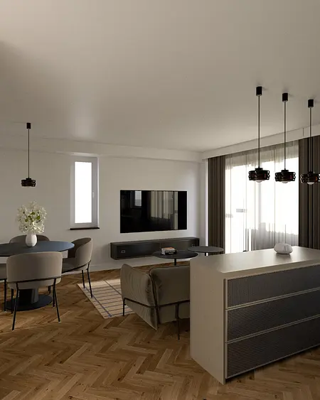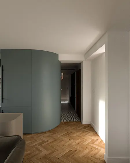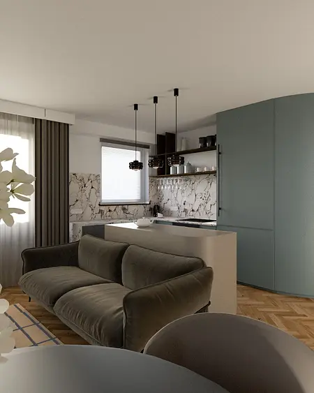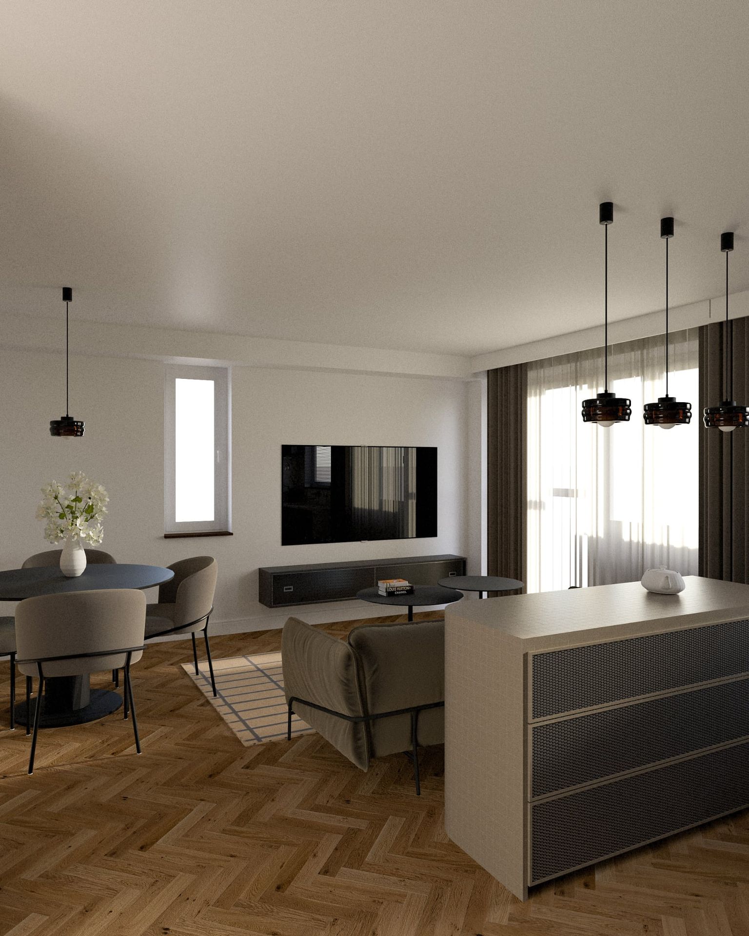 To wnętrze jest współczesną reinterpretacją mieszkania z lat 70. — z zachowaniem jego klimatu, ale w uproszczonej, nowoczesnej formie. Bazuje na ciepłych materiałach, stonowanej kolorystyce i miękkiej geometrii inspirowanej modernizmem. Subtelne akcenty vintage nadają mu charakteru, bez dosłownego odtwarzania epoki. To przestrzeń z duszą, dopasowana do współczesnego stylu życia.
