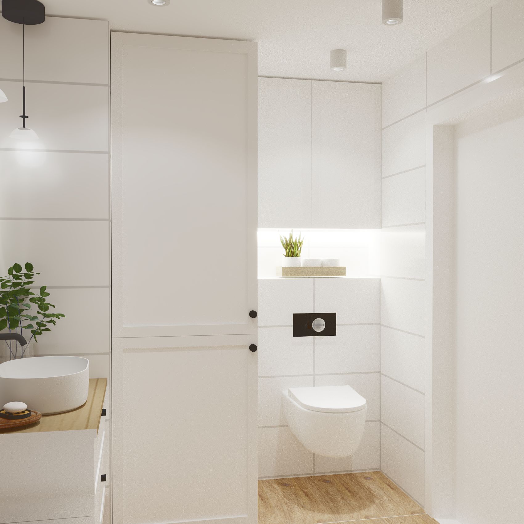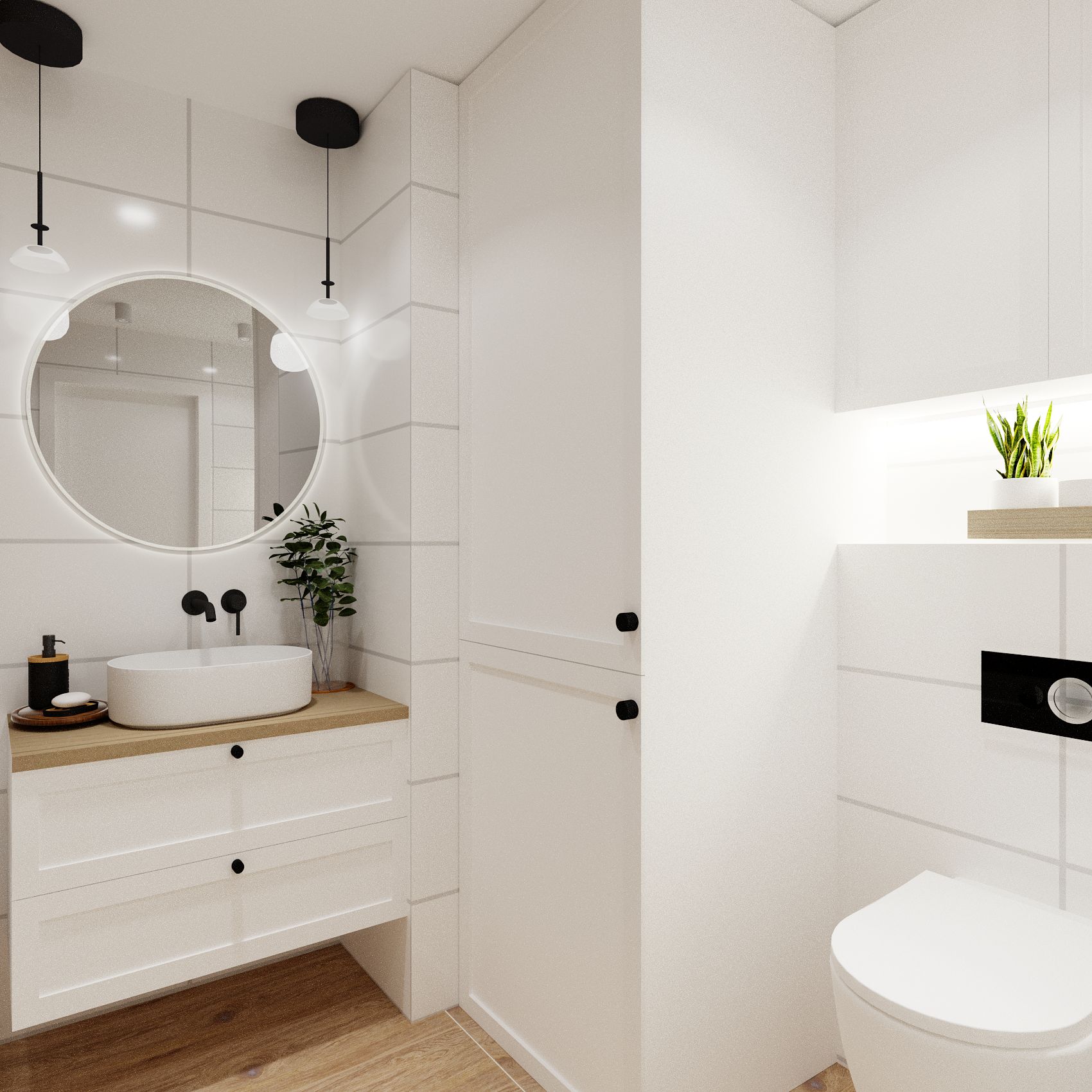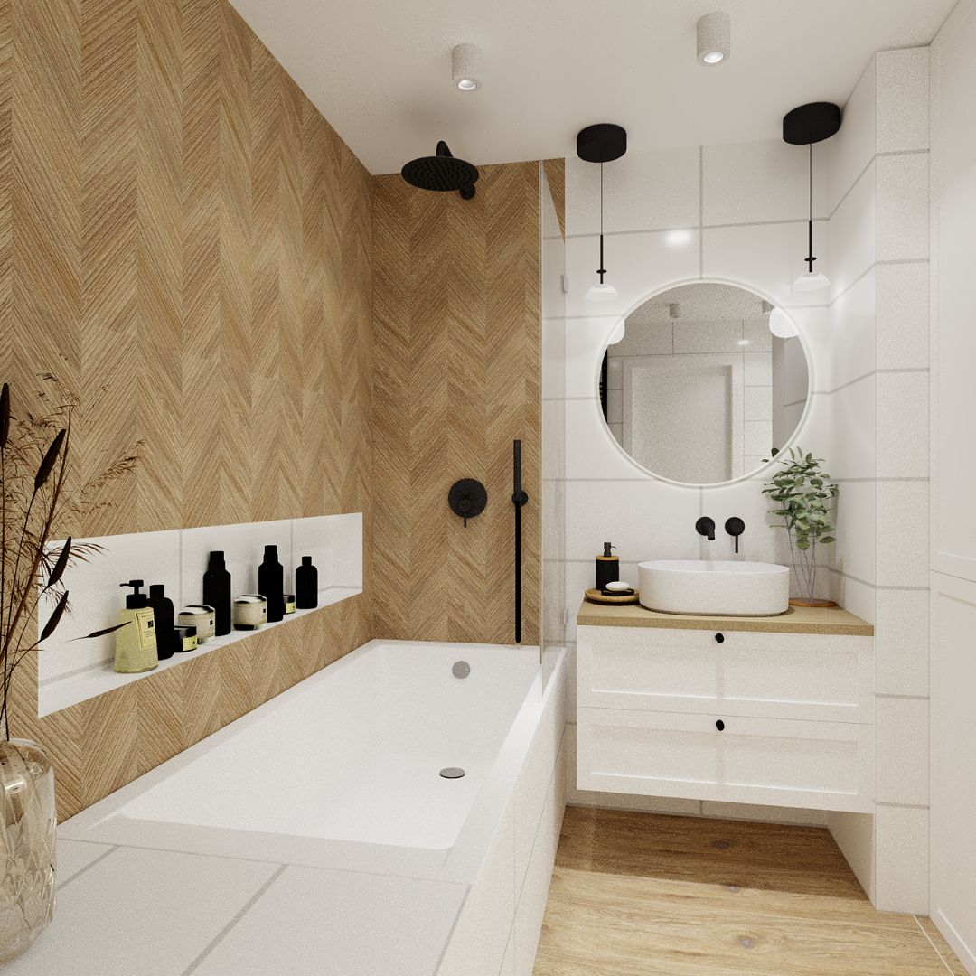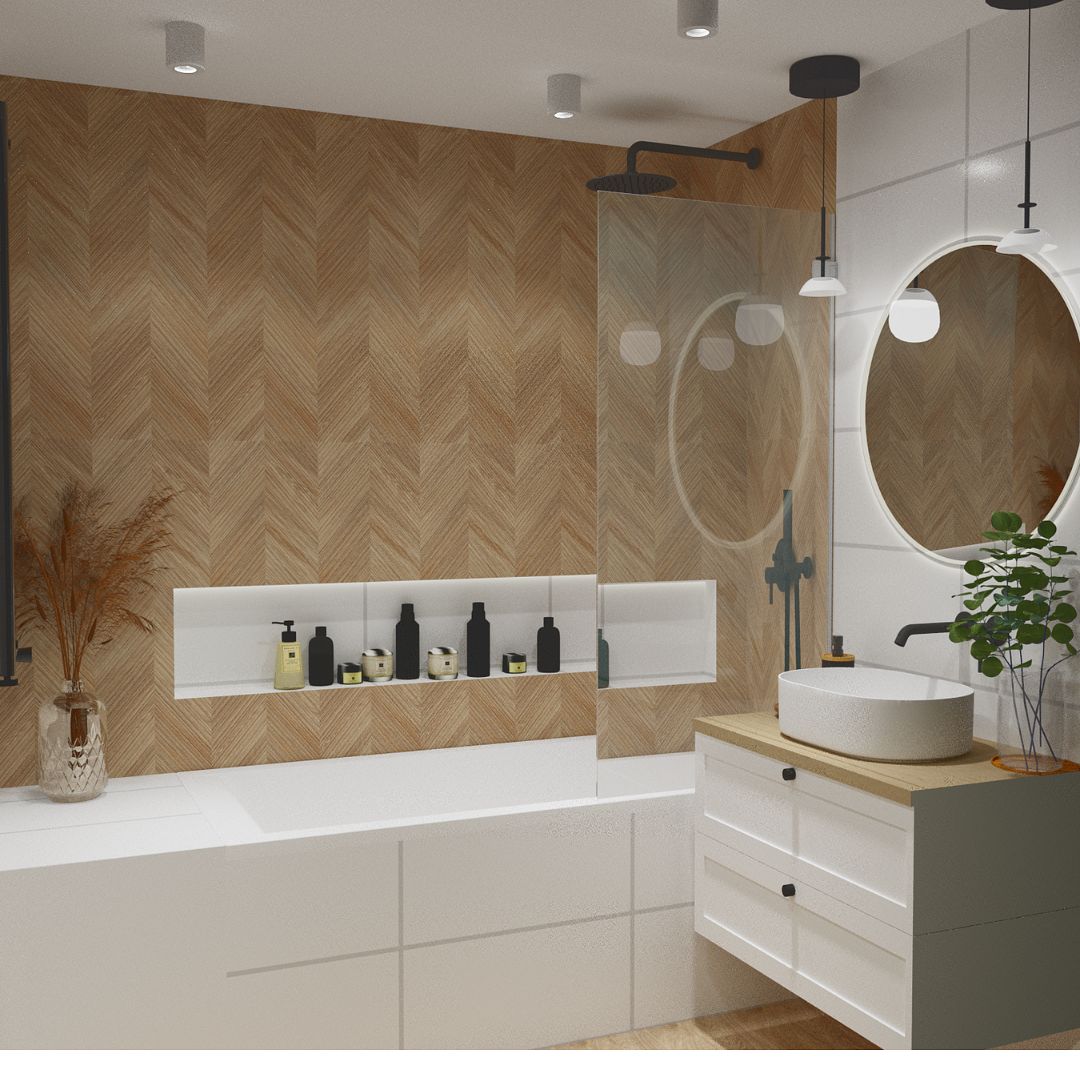 W tej łazience połączyłam ponadczasową biel z ciepłym drewnem, tworząc przytulną i harmonijną przestrzeń.