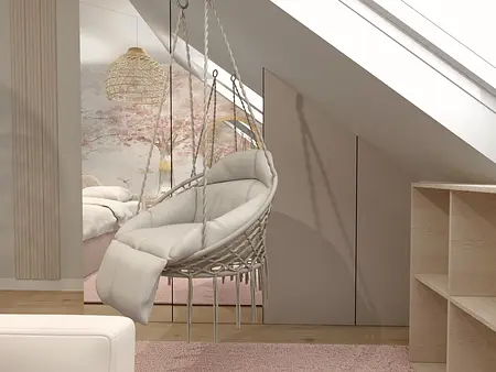 Tapeta z bajkowym drzewem, bujaczka z wikliny, piękna wiklinowa lampa i łóżko z zagłówkiem w pięknym kolorze, tworzy urocze pomieszczenie.
