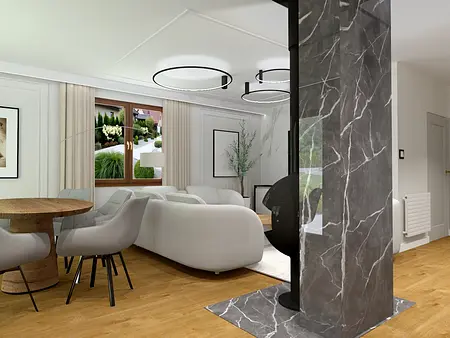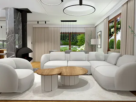 Luksusowy parter domu został stworzony z myślą o luksusie, ponadczasowości i elegancji. Zastosowane materiały marmuru w dwóch kolorach, szarości i kaszmiru, drewna w kuchni zostały dopasowane kolorystycznie do istniejącej pięknej podłogi drewnianej. Kominek nie tylko pełni funkcję docieplenia ale również biżuterii, dekoracji wnętrza. Jasne sofy i stoliki połączone designem są spójne i eleganckie. Kolory przeplatają się w całym wnętrzu. Jasne wnętrza są nie tylko ponadczasowe, ale również spójne i funkcjonalne.