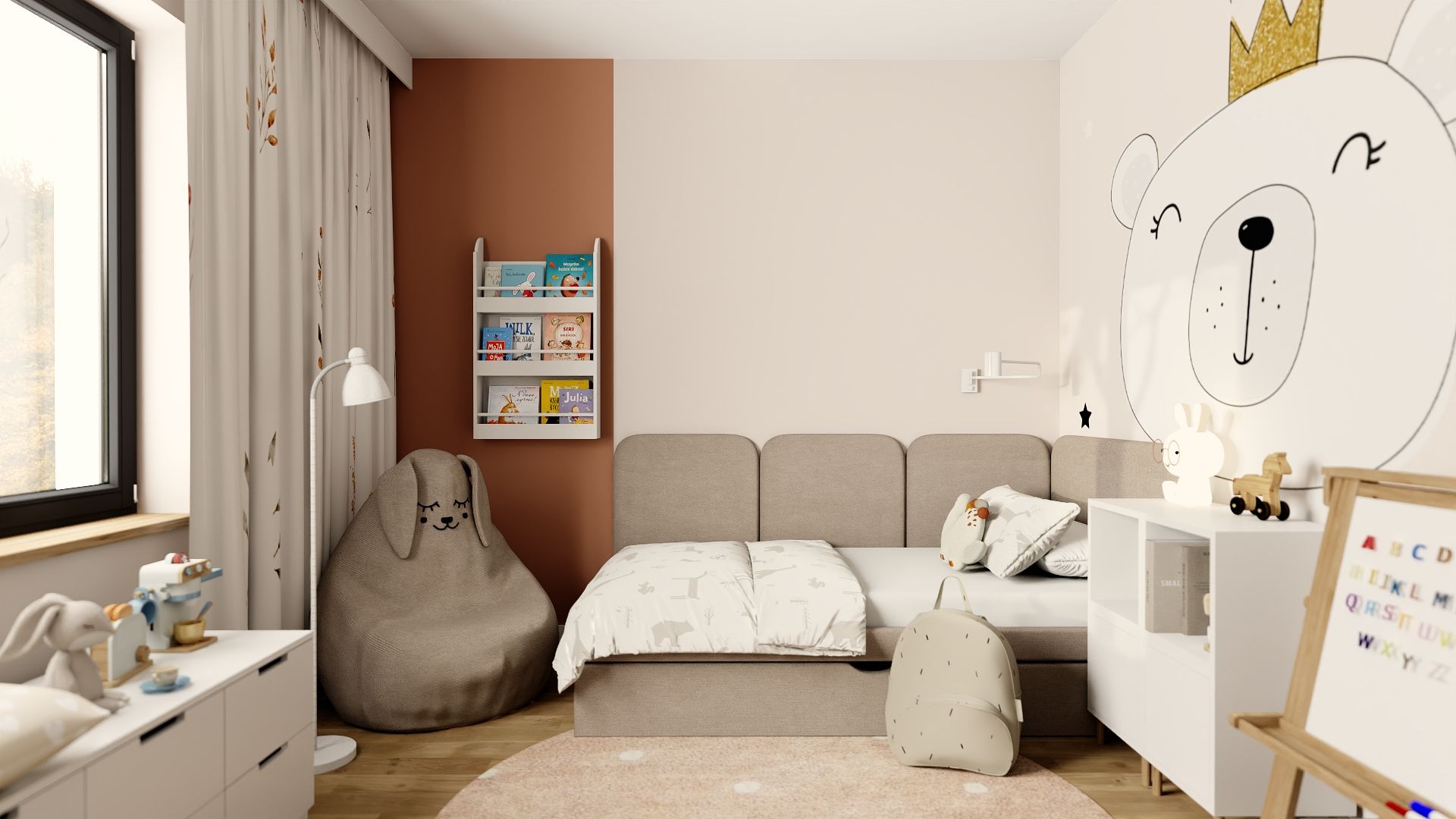 Wnętrze sypialni z beżowym łóżkiem, drewnianymi meblami, styl glamour, japandi, nowoczesny, współczesny. 4 zdjęć w projekcie Zobacz projekt