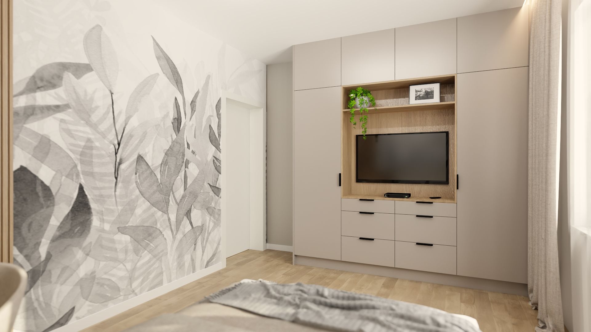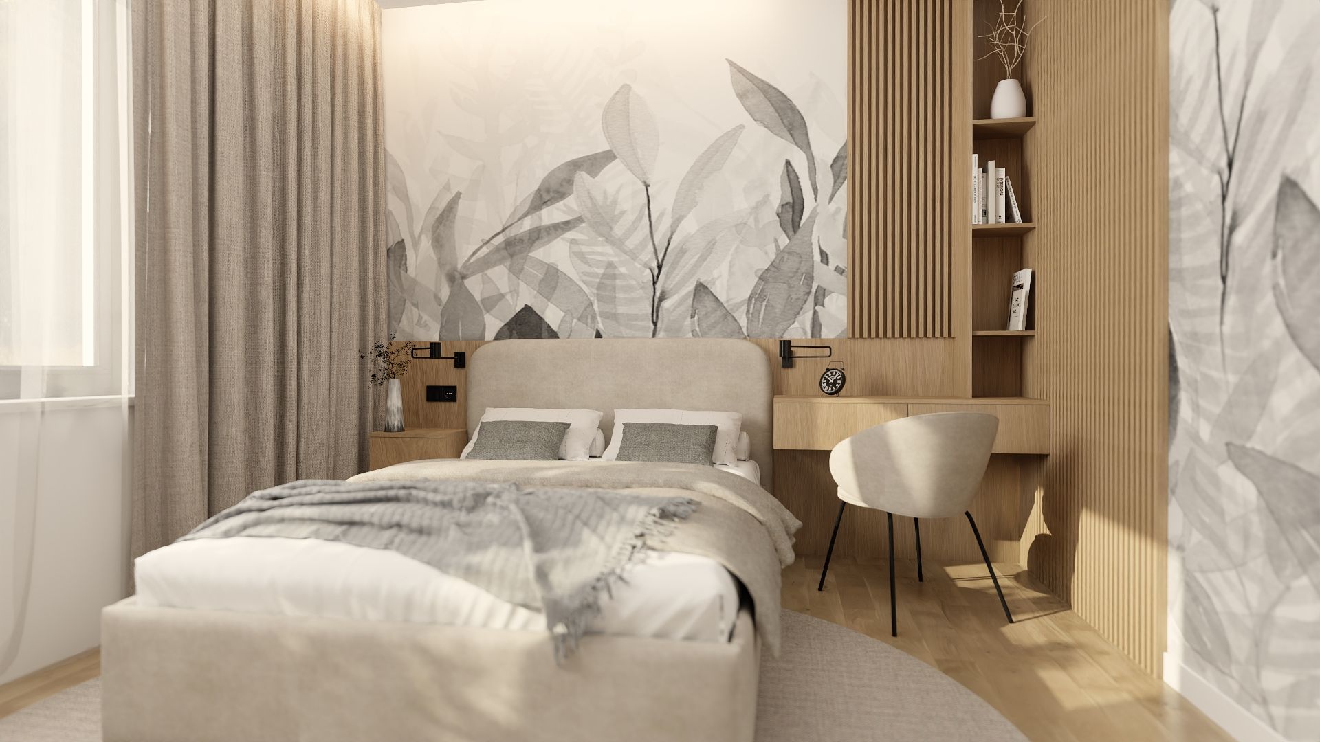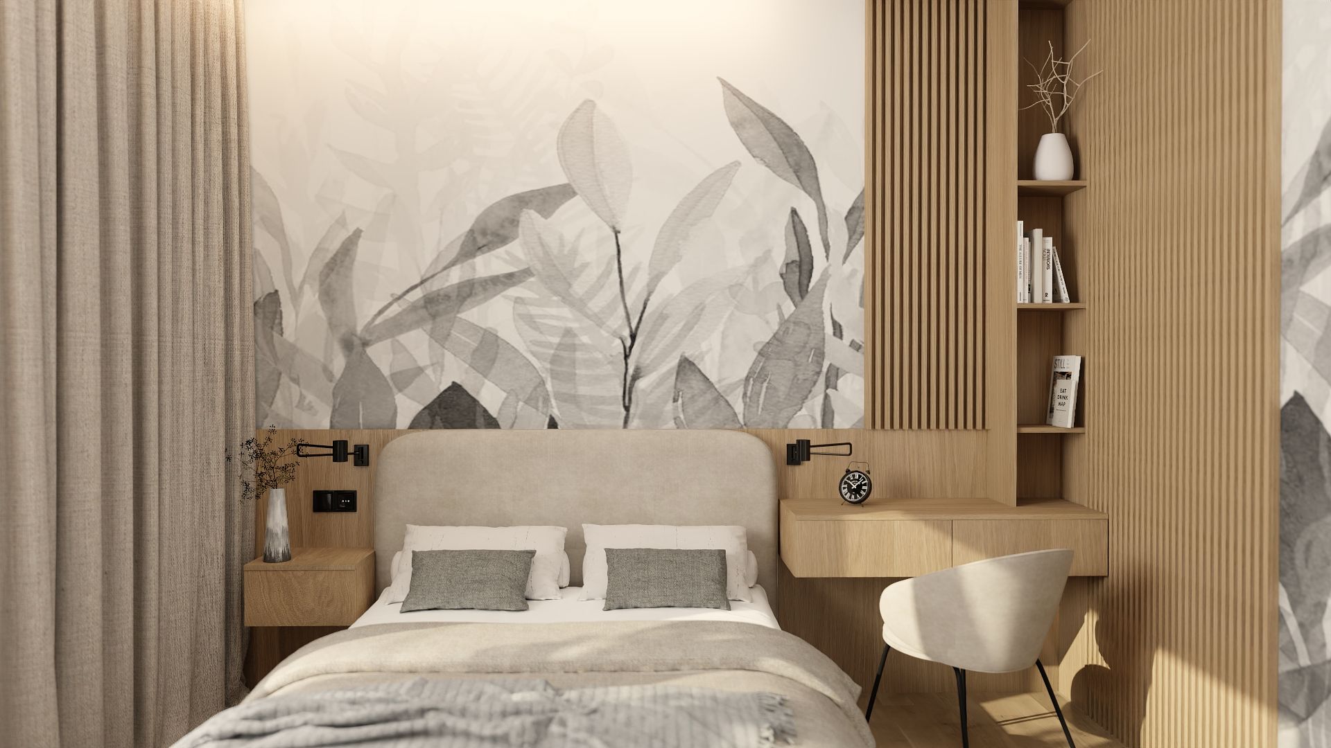 Wnętrze sypialni z beżowym łóżkiem, drewnianymi meblami, styl glamour, japandi, nowoczesny, współczesny. 4 zdjęć w projekcie Zobacz projekt