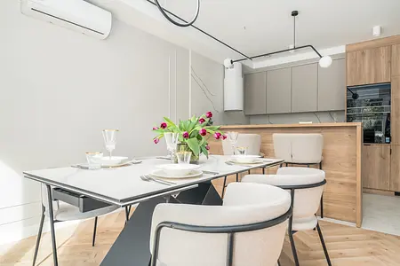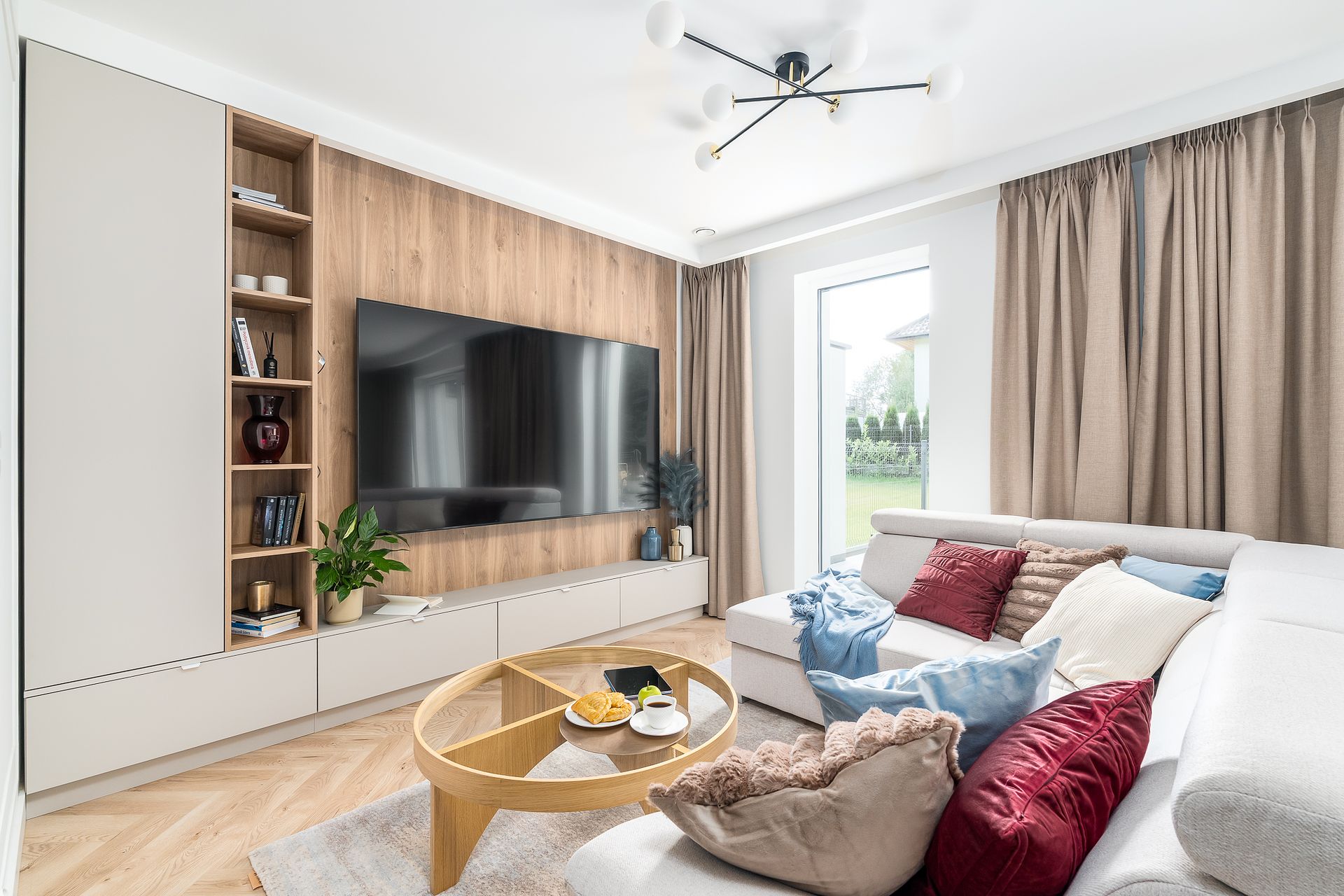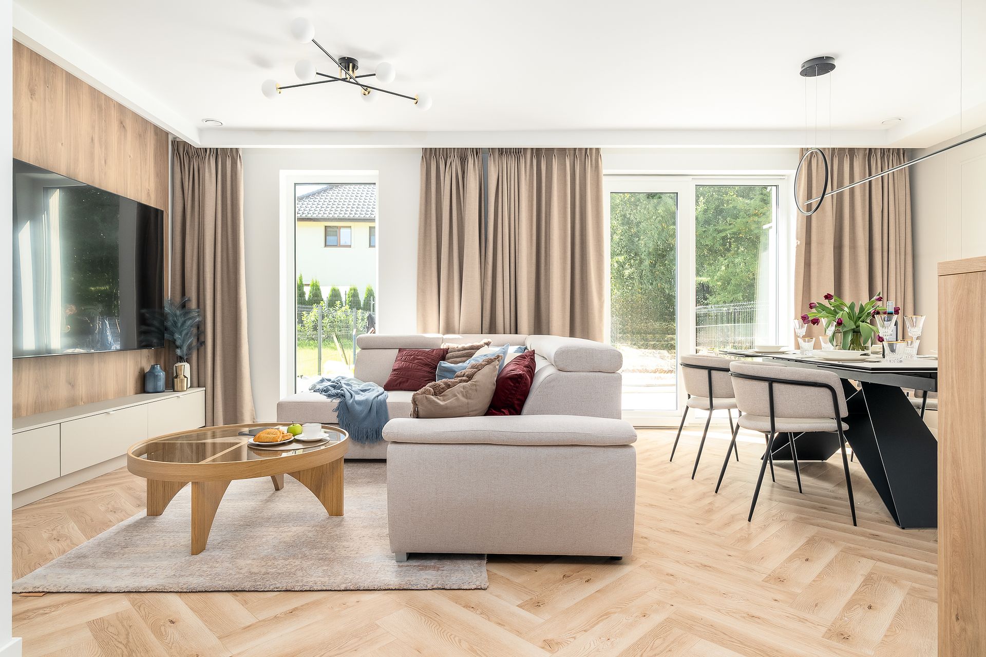 Wnętrze salonu z jadalnią utrzymano w nowoczesnej, stonowanej stylistyce z dominacją beży i naturalnego drewna. Jasna podłoga w jodełkę oraz drewniana ściana RTV ocieplają przestrzeń i porządkują strefę wypoczynku. Całość dopełniają pełne zasłony, czarne akcenty oświetlenia oraz minimalistyczny stół z tapicerowanymi krzesłami.