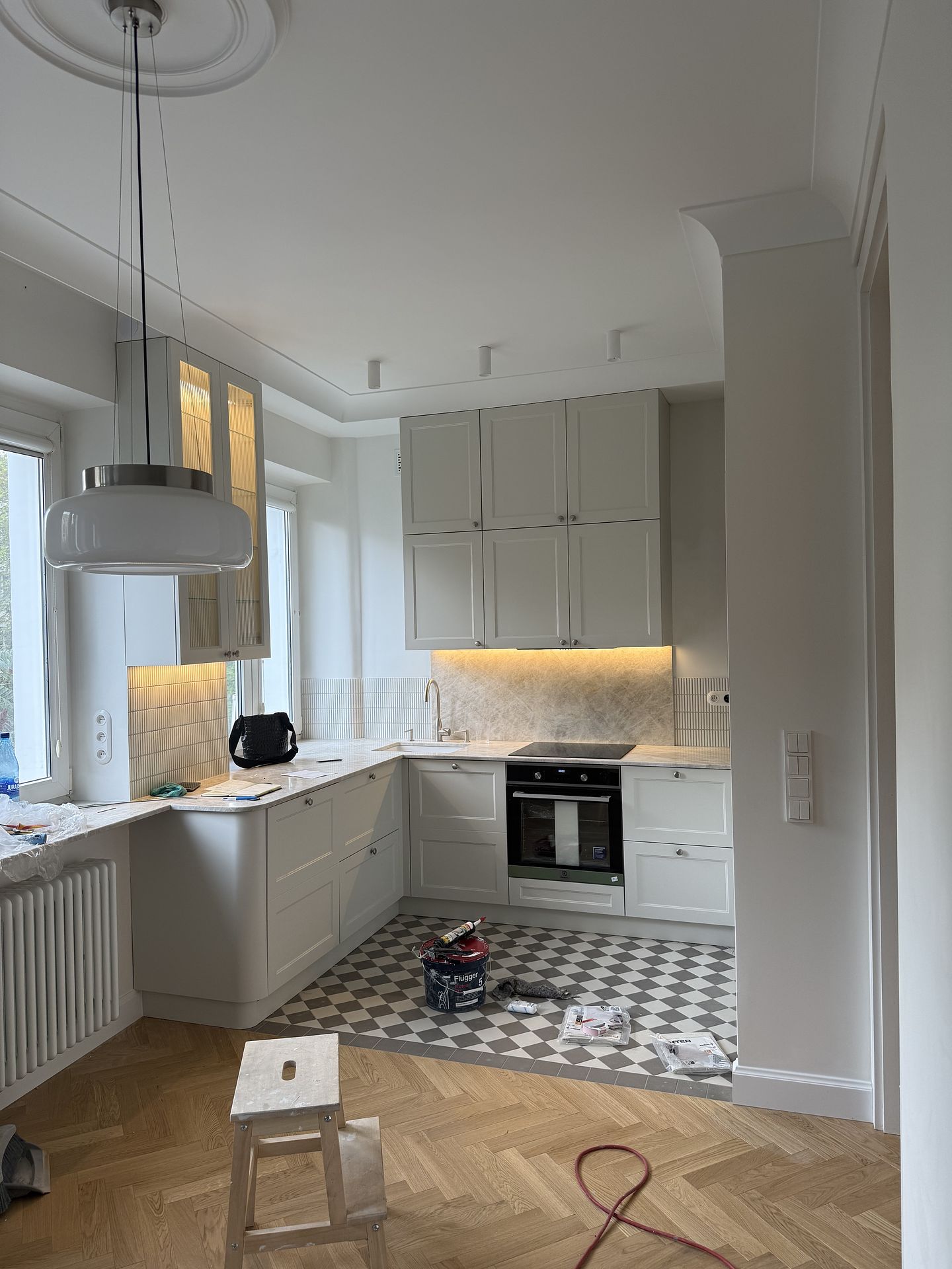 Jasna kuchnia modern retro z kamiennym blatem w mieszkaniu w kamienicy