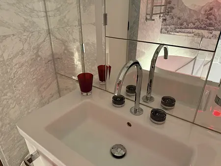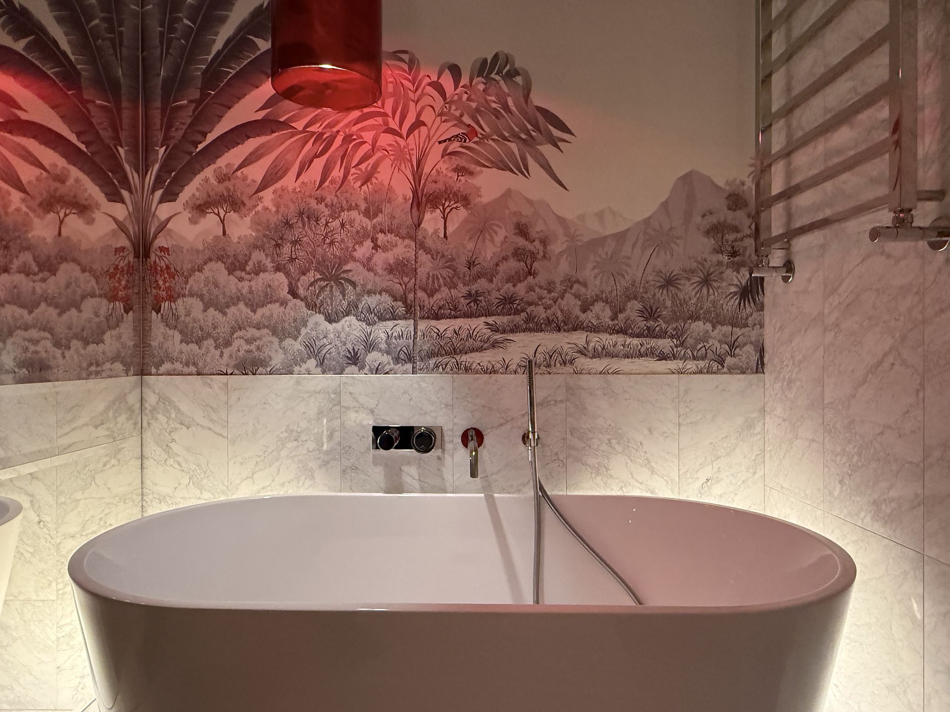 Jasna, nastrojowo oświetlona luksusowa łazienka z marmurem i lustrami oraz tapetą na ścianach z wanną wolnostojącą w projekcie apartmantu wedodesign.pl