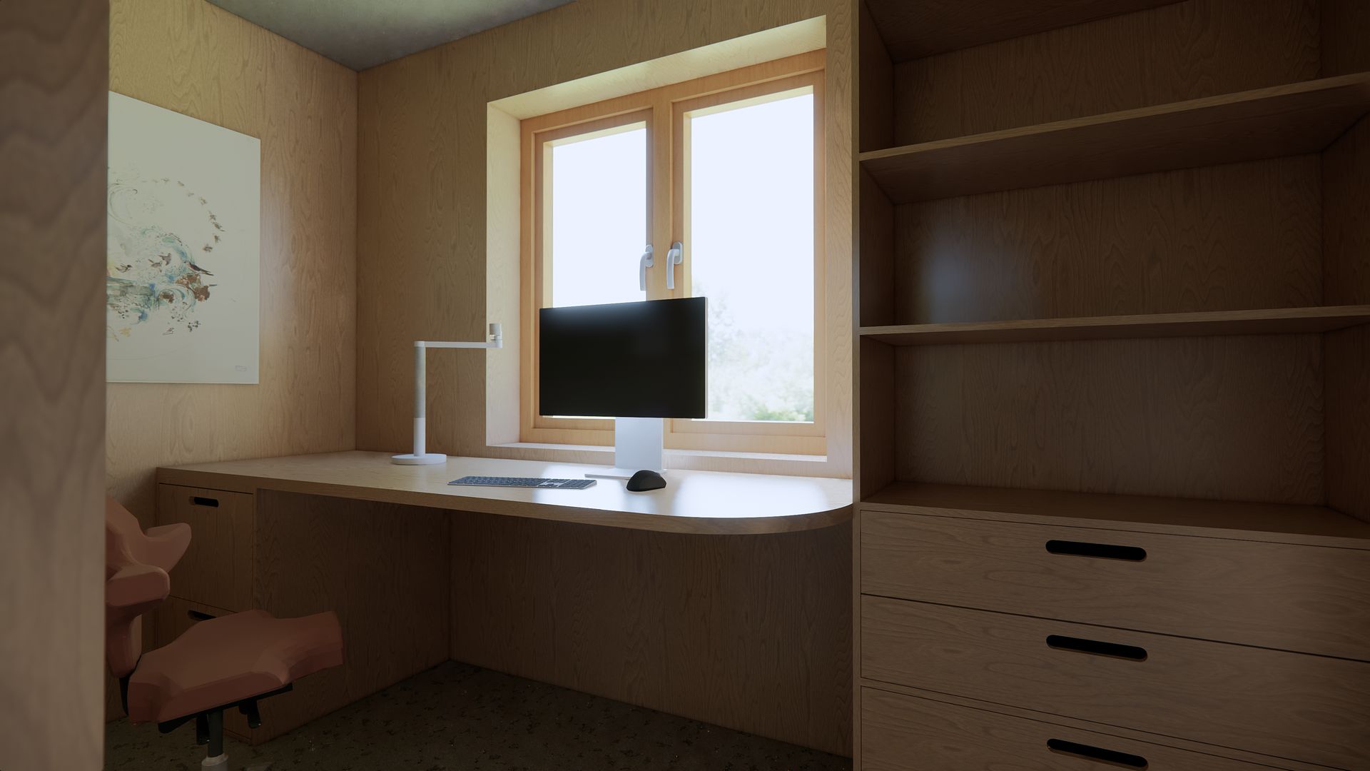 Ze względu na niewielki metraż pomieszczenia komunikacja przebiega przez całą jego długość. Długi blat roboczy pozwala na spokojną pracę przy monitorze, laptopie, dokumentach oraz innych narzędziach jednocześnie.