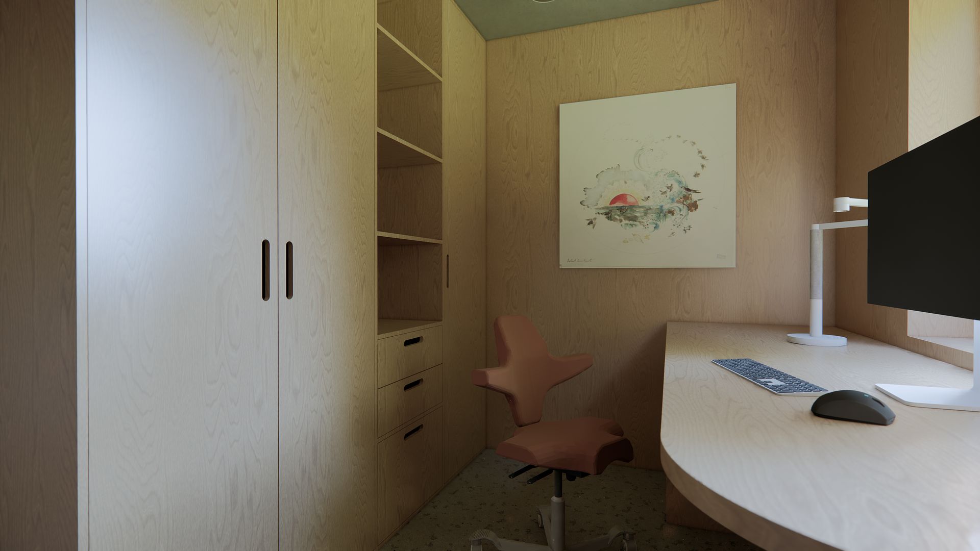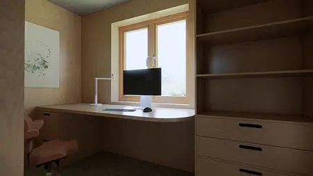 Pozostała przestrzeń została maksymalnie wykorzystana na przechowywanie. Na otwartym regale w świetle wejścia można przedstawić zdjęcia, pamiątki lub dekoracje. Przechowywanie w głębi pomieszczenia jest podzielone na otwarty regał na osobiste przedmioty oraz na zamknięte szafy na dyskretne dokumenty. Pod blatem znajduje się również kontenerek w zabudowie, aby najpotrzebniejsze artykuły biurowe były zawsze dostępne pod ręką.
