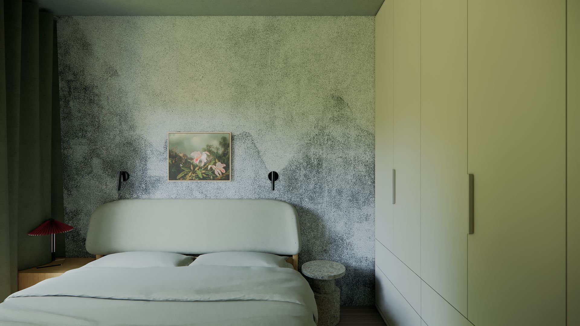 Pomimo niewielkich rozmiarów pomieszczenia, w sypialni znajduje się pełnowymiarowe łóżko- ten mebel został ustalony jako bezkompromisowy element. Cała przestrzeń orbituje właśnie wokół niego.