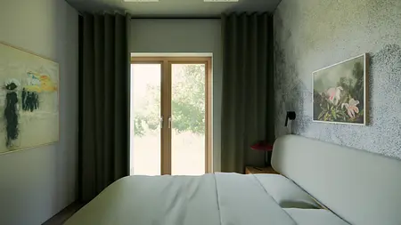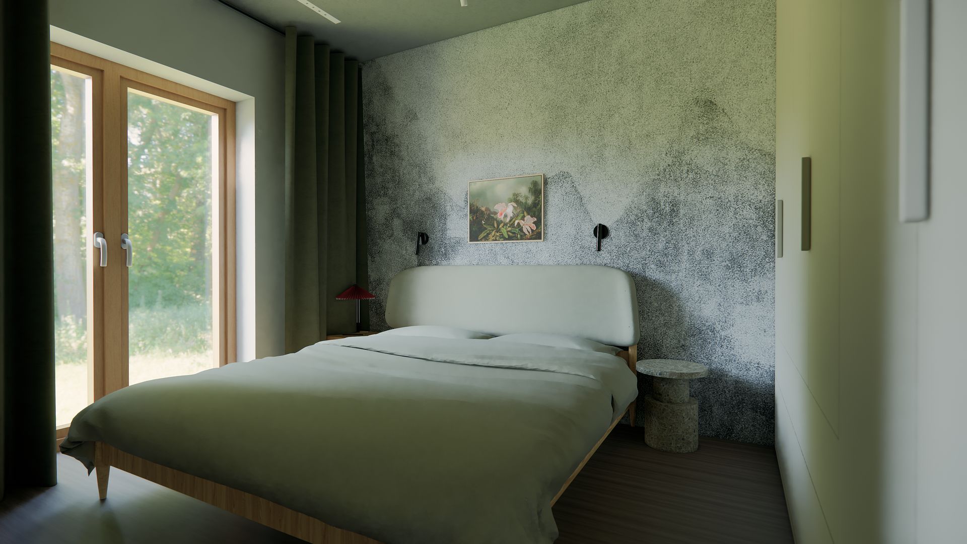 Sypialnia została zaprojektowana w stonowanym kolorach, aby łatwo można było wejść w stan relaksu, dbając o odpowiedni wypoczynek.