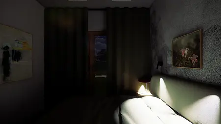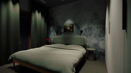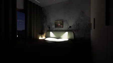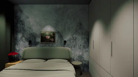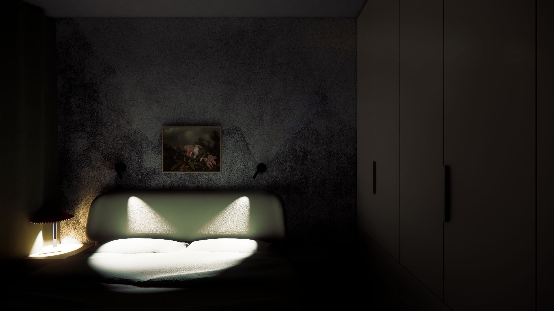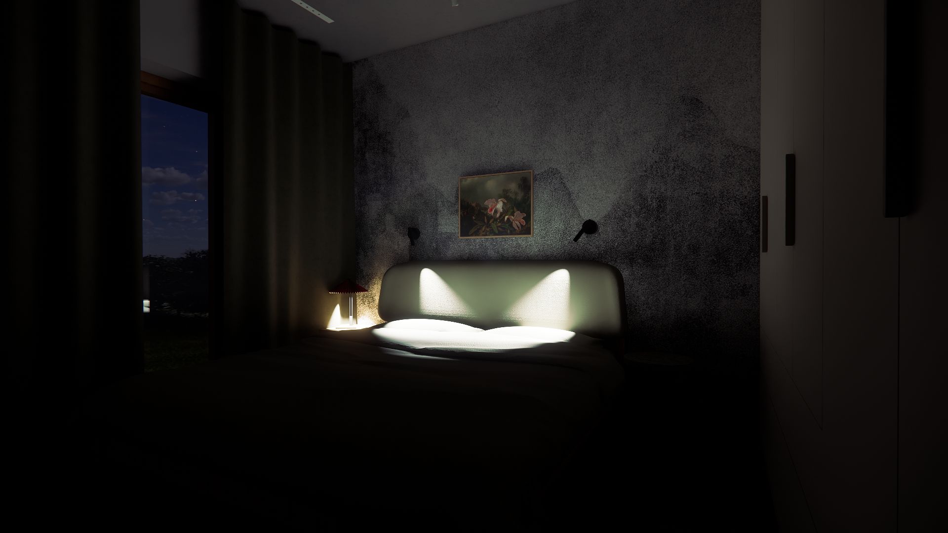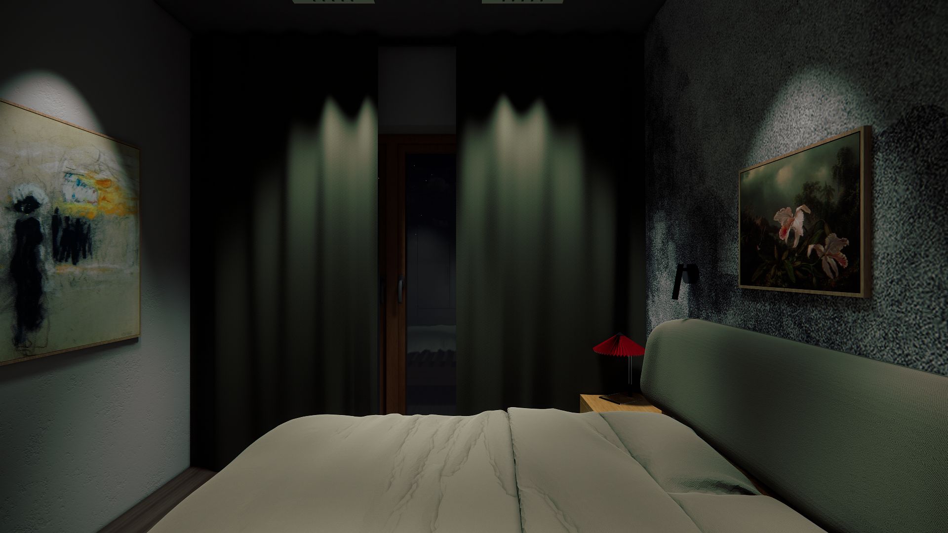 Zastosowane oświetlenie ma dwie funkcje. Osprzęt sufitowy, choć zaprojektowany praktycznie, nadal jest źródłem miękkiego, stonowanego światła. Dodatkowe elementy oświetlenia stanowią niewielkie kinkiety do czytania nad łóżkiem, spoty skierowane na dwa obrazy, oraz niewielka lampka nocna, wprowadzające w czas snu.