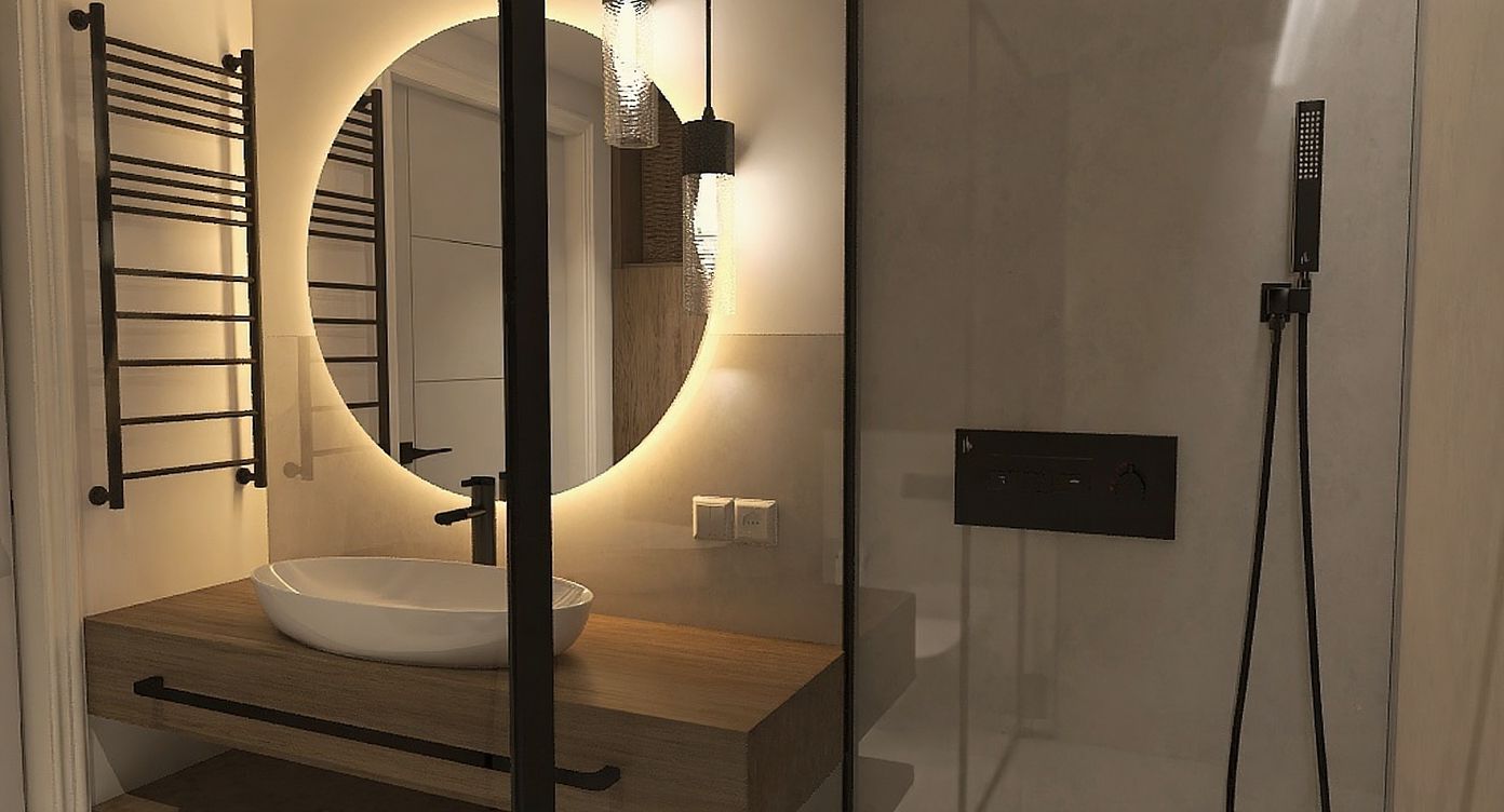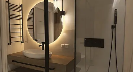 Centralnym punktem wnętrza jest okrągłe lustro z podświetleniem LED, które nadaje przestrzeni głębi i klimatu spa. Drewno w połączeniu z betonową szarością i czarnymi elementami armatury tworzy efekt harmonii i kontrastu zarazem.