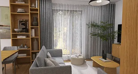 Ten salon to połączenie lekkości skandynawskiego minimalizmu z ciepłem naturalnych materiałów. Drewniane elementy w odcieniu miodowego dębu ocieplają przestrzeń i wprowadzają przytulny nastrój, a stonowana szarość tapicerki oraz zasłon nadaje wnętrzu eleganckiej prostoty.