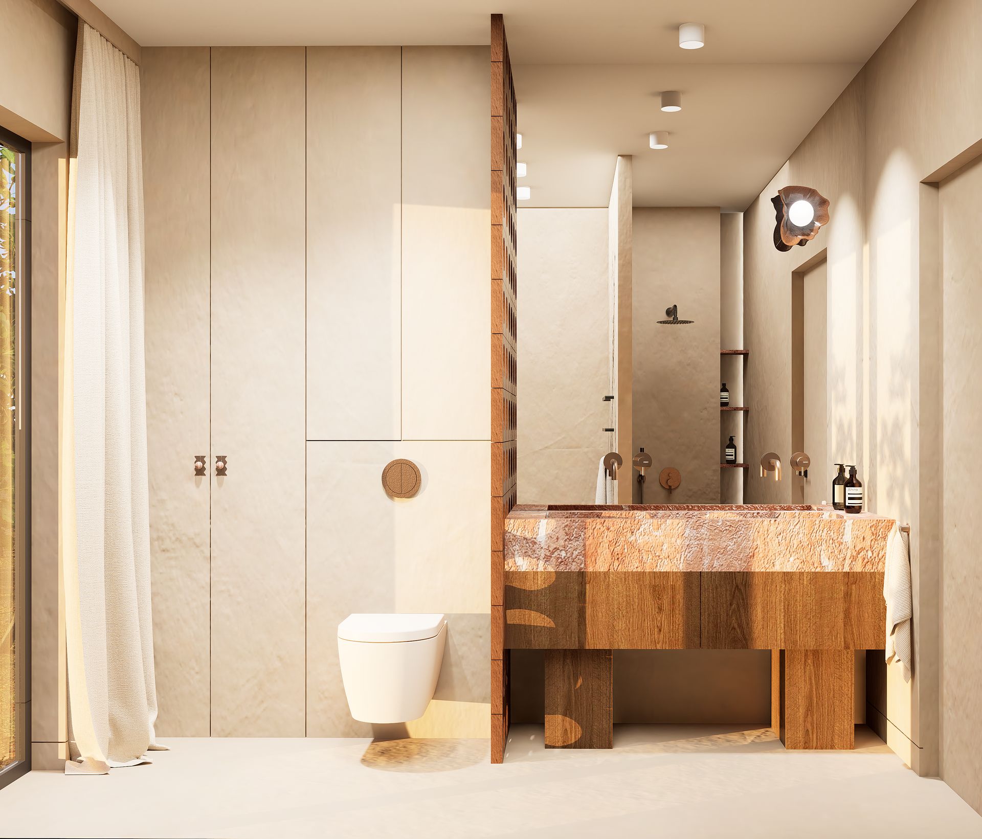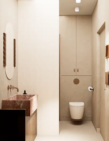 Nowoczesna łazienka w stylu japandi z minimalistycznym wykończeniem i drewnianymi detalami. 9 zdjęć w projekcie Zobacz projekt