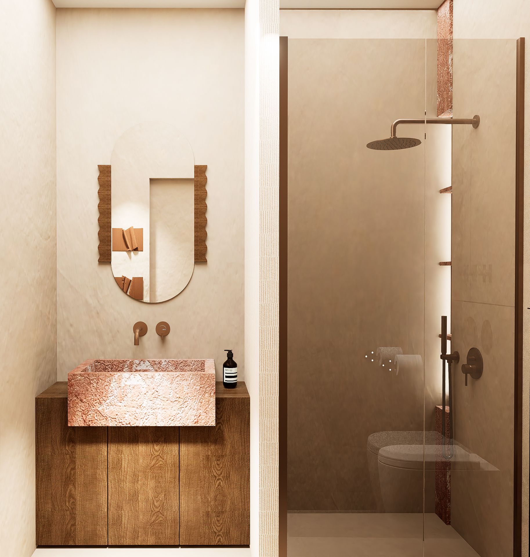 Nowoczesna łazienka w stylu japandi z drewnianymi detalami i minimalistycznym wystrojem. 4 zdjęć w projekcie Zobacz projekt