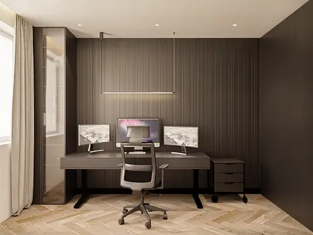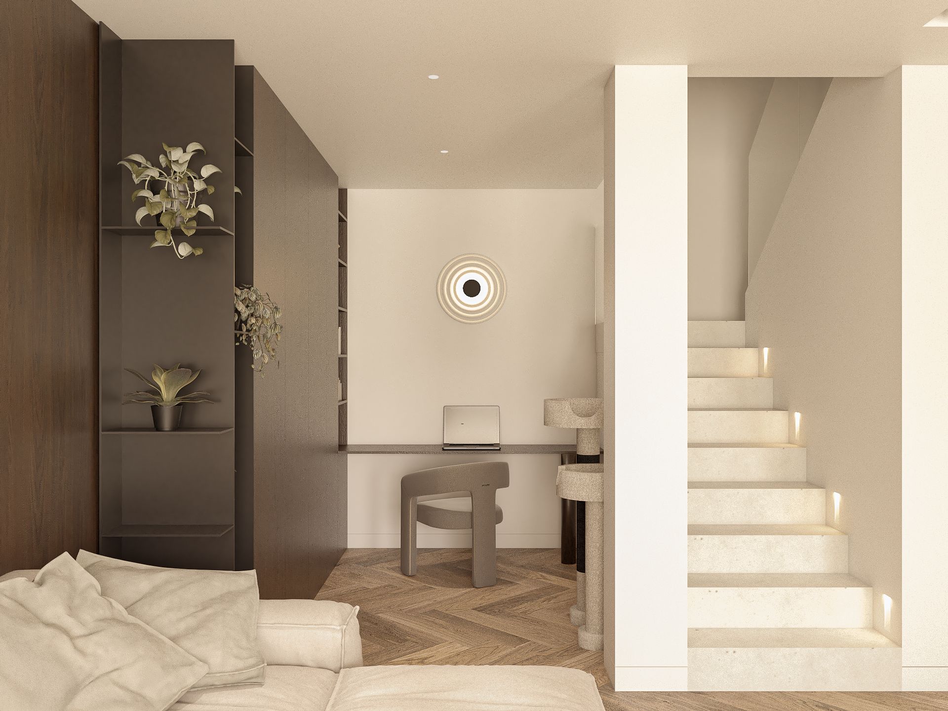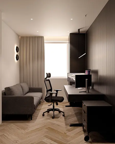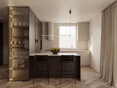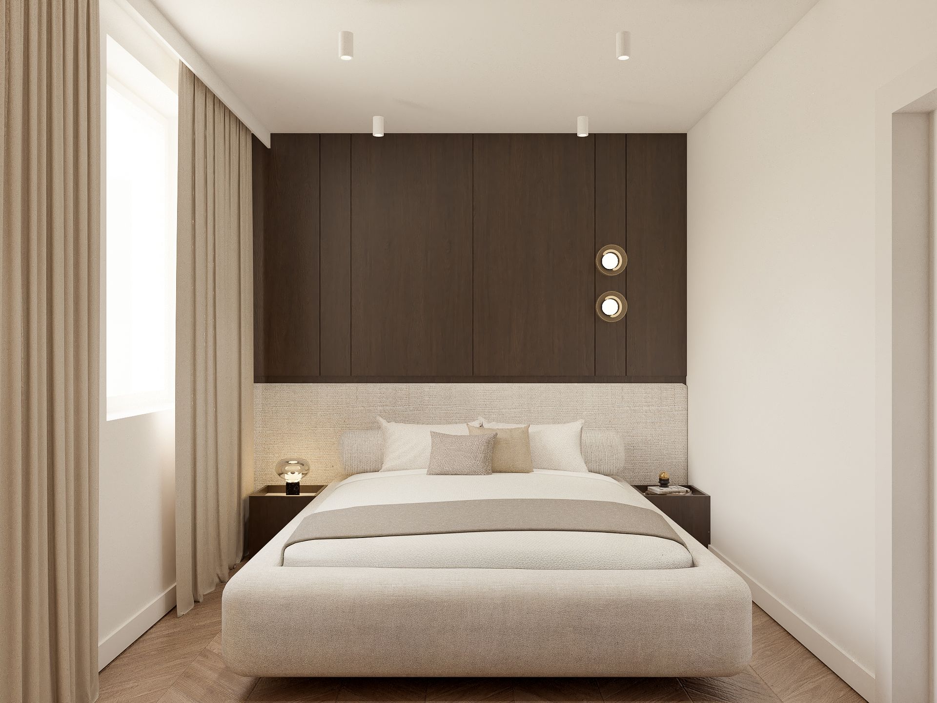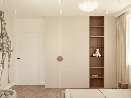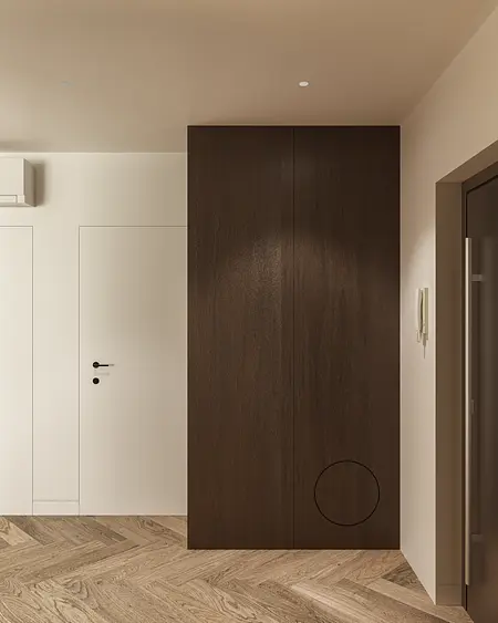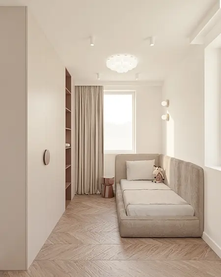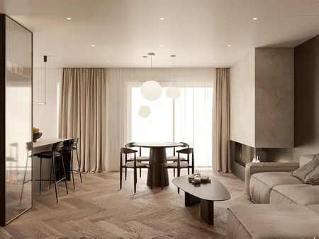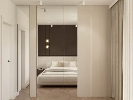 Wnętrze oparte na spokoju, świetle i miękkich proporcjach. Jasna, ciepła baza spotyka się tu z głębszymi akcentami drewna, które nadają przestrzeni rytm i charakter. Lustra, tkaniny i naturalne materiały budują warstwową kompozycję, w której wszystko pozostaje w równowadze. To projekt, w którym estetyka nie jest dodatkiem — jest częścią codzienności. Światło prowadzi przestrzeń, materiały dodają jej ciepła, a spokojna paleta kolorów pozwala wnętrzu oddychać. Miejsce zaprojektowane tak, by dobrze się w nim żyło.