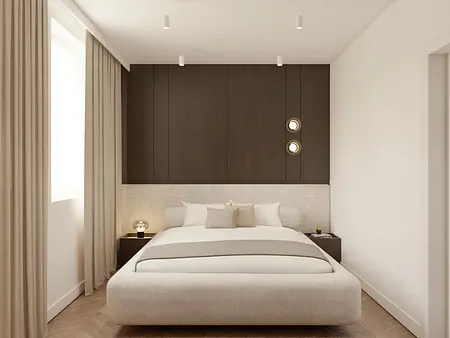 Wnętrze sypialni z łóżkiem, drewnianymi elementami i nowoczesnym oświetleniem. 9 zdjęć w projekcie Zobacz projekt
