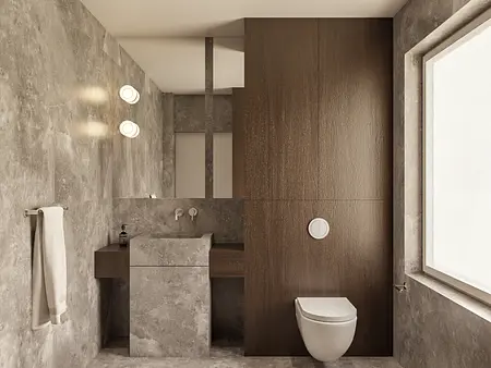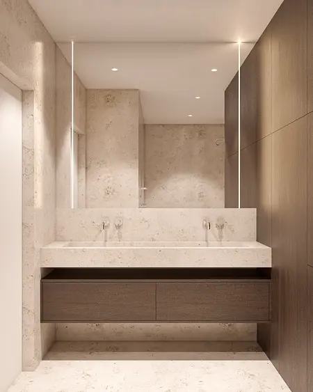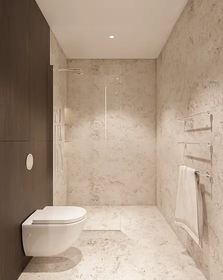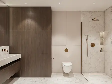 Nowoczesna łazienka w stylu japandi z minimalistycznym wykończeniem i drewnianymi detalami. 9 zdjęć w projekcie Zobacz projekt