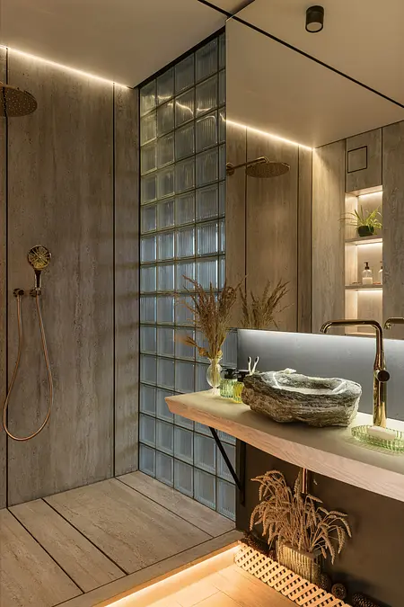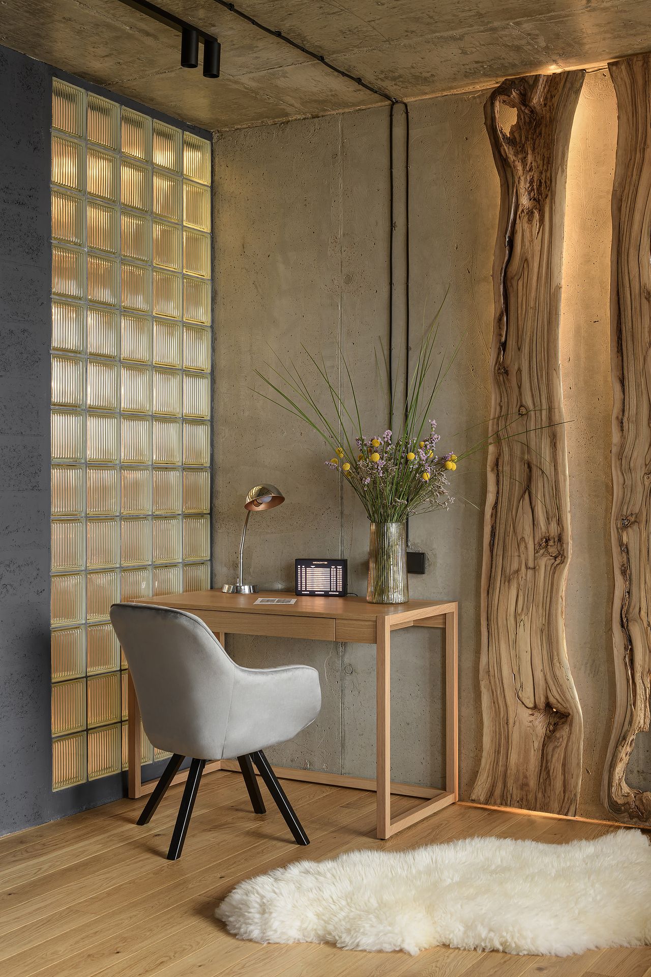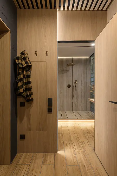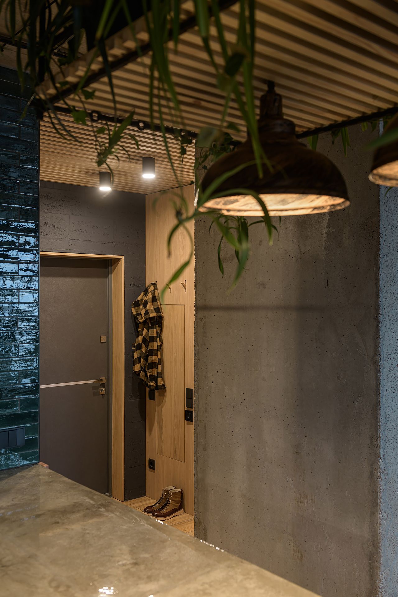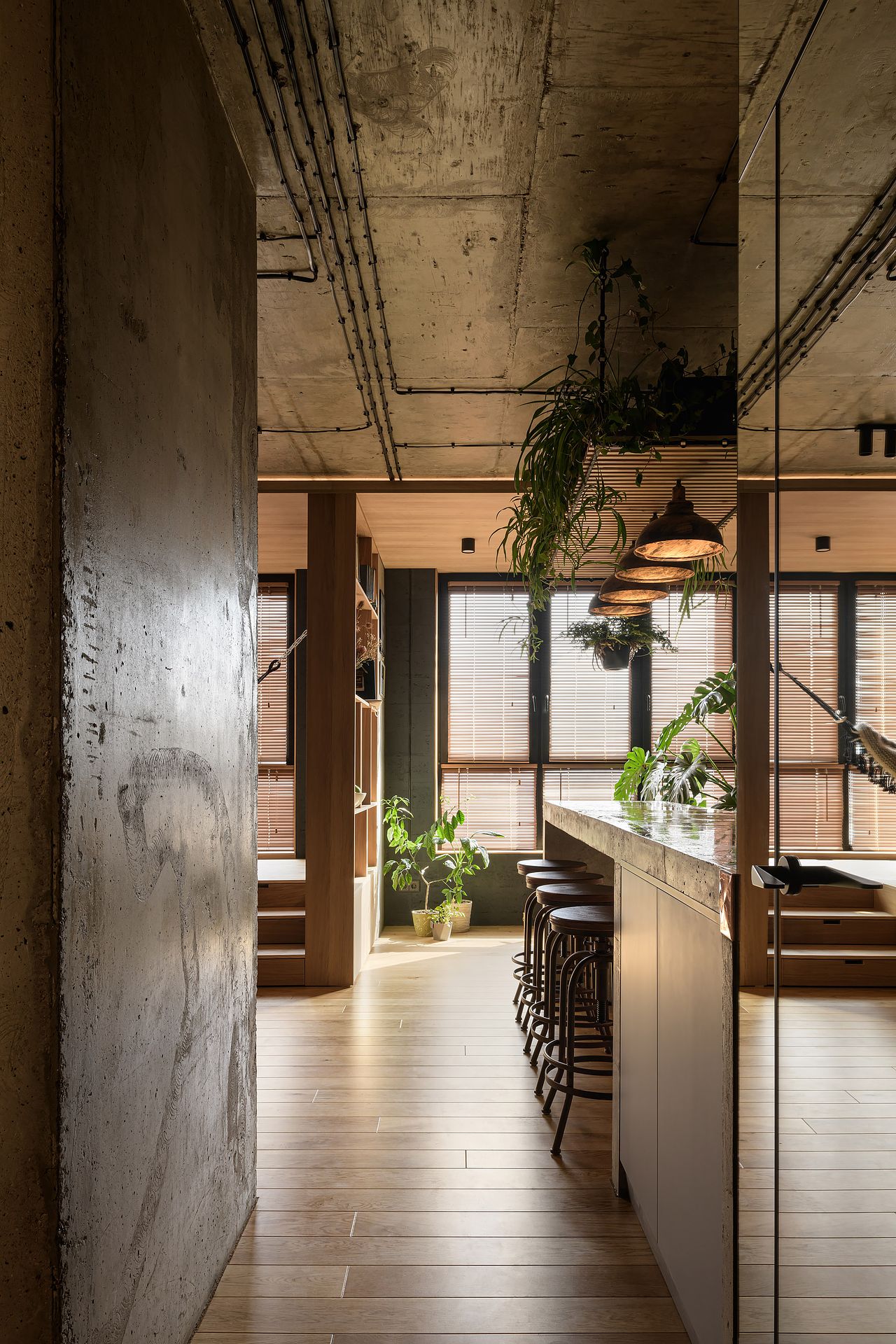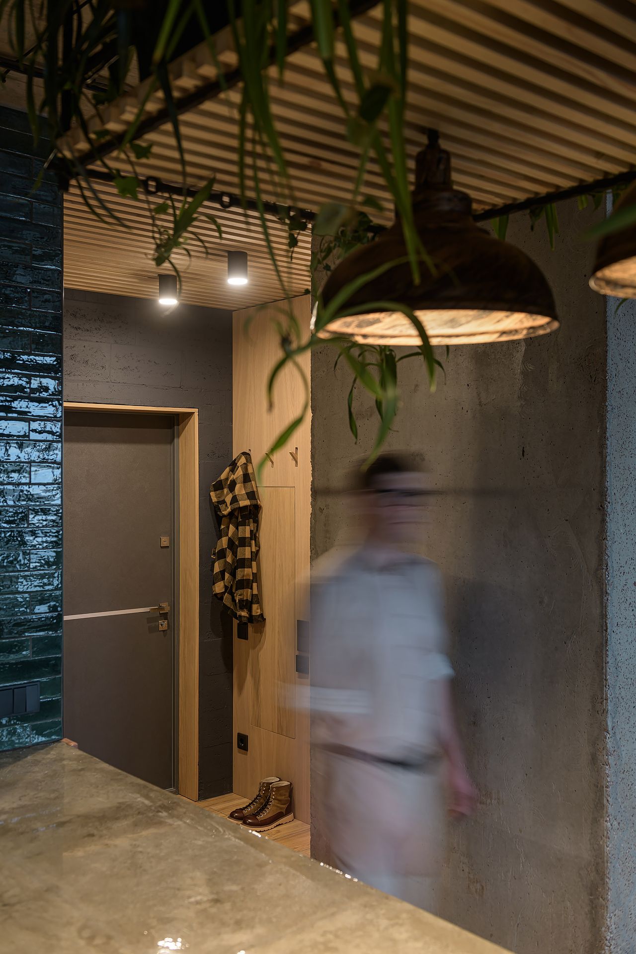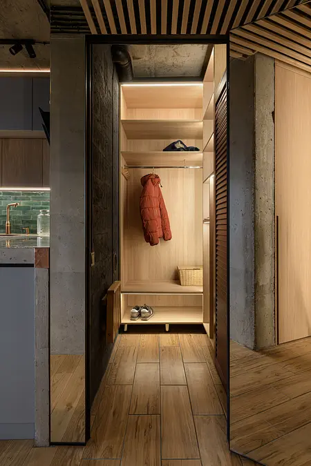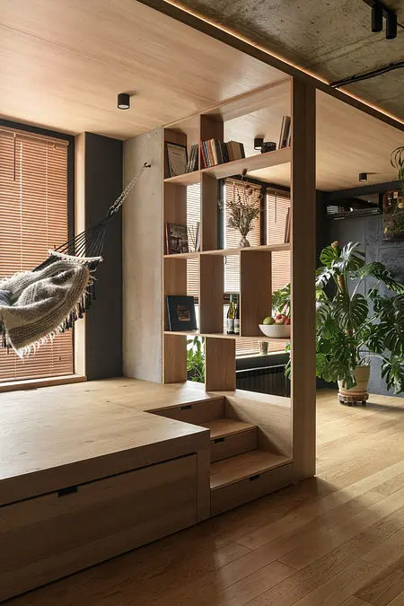 Pomimo kompaktowego metrażu mieszkanie zostało bardzo dobrze zaprojektowane, aby maksymalnie wykorzystać dostępną przestrzeń. Jasne drewniane podłogi oraz ściany z naturalnych materiałów tworzą ciepłą atmosferę, a liczne zielone rośliny dodają świeżości i przytulności.