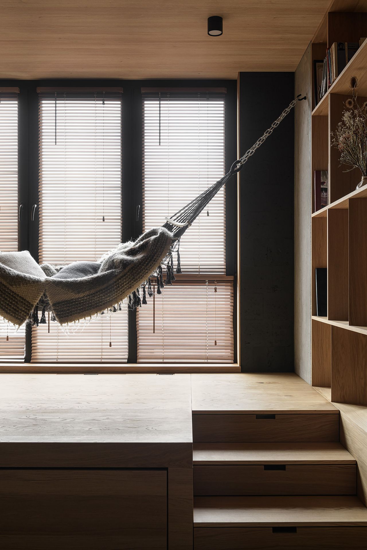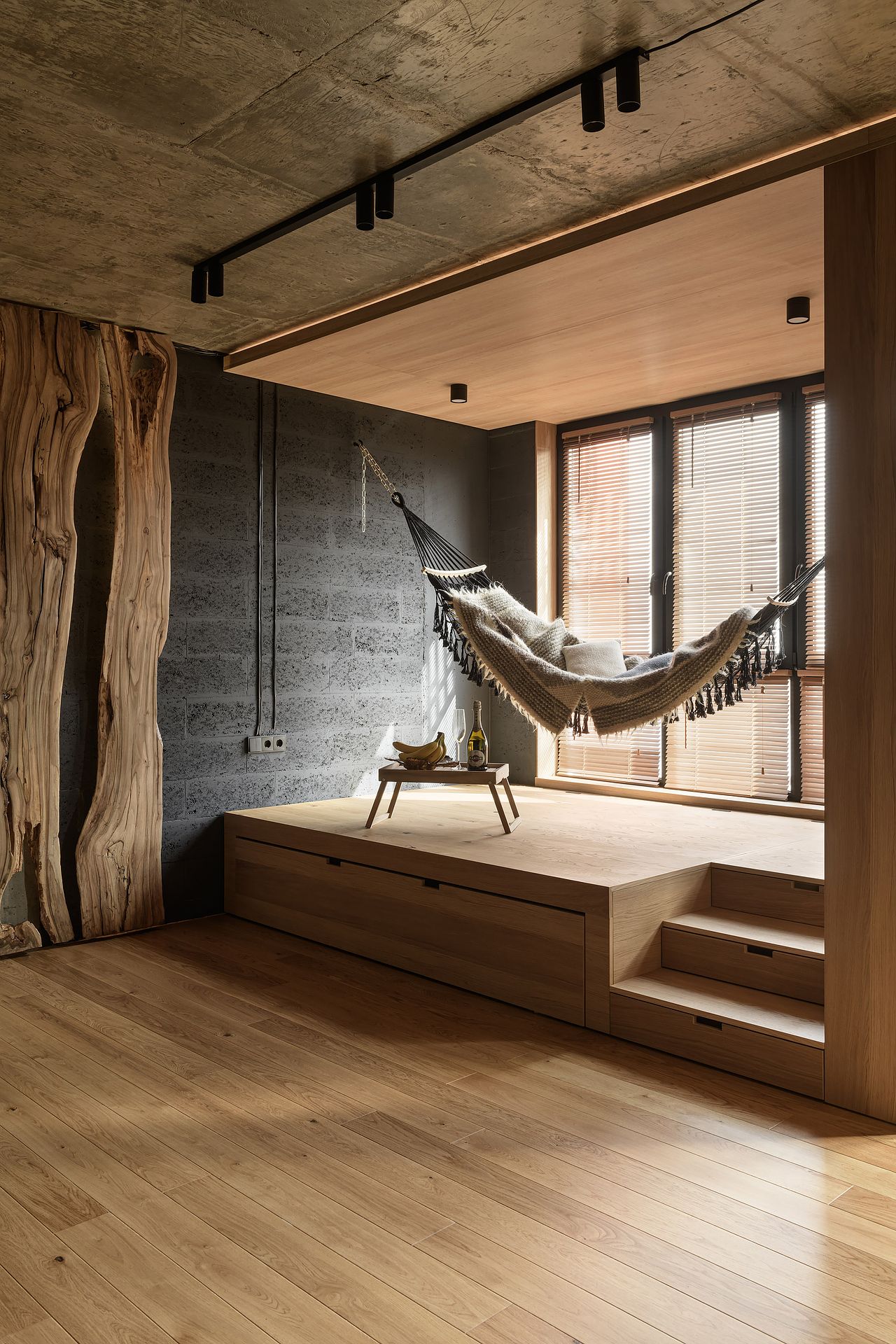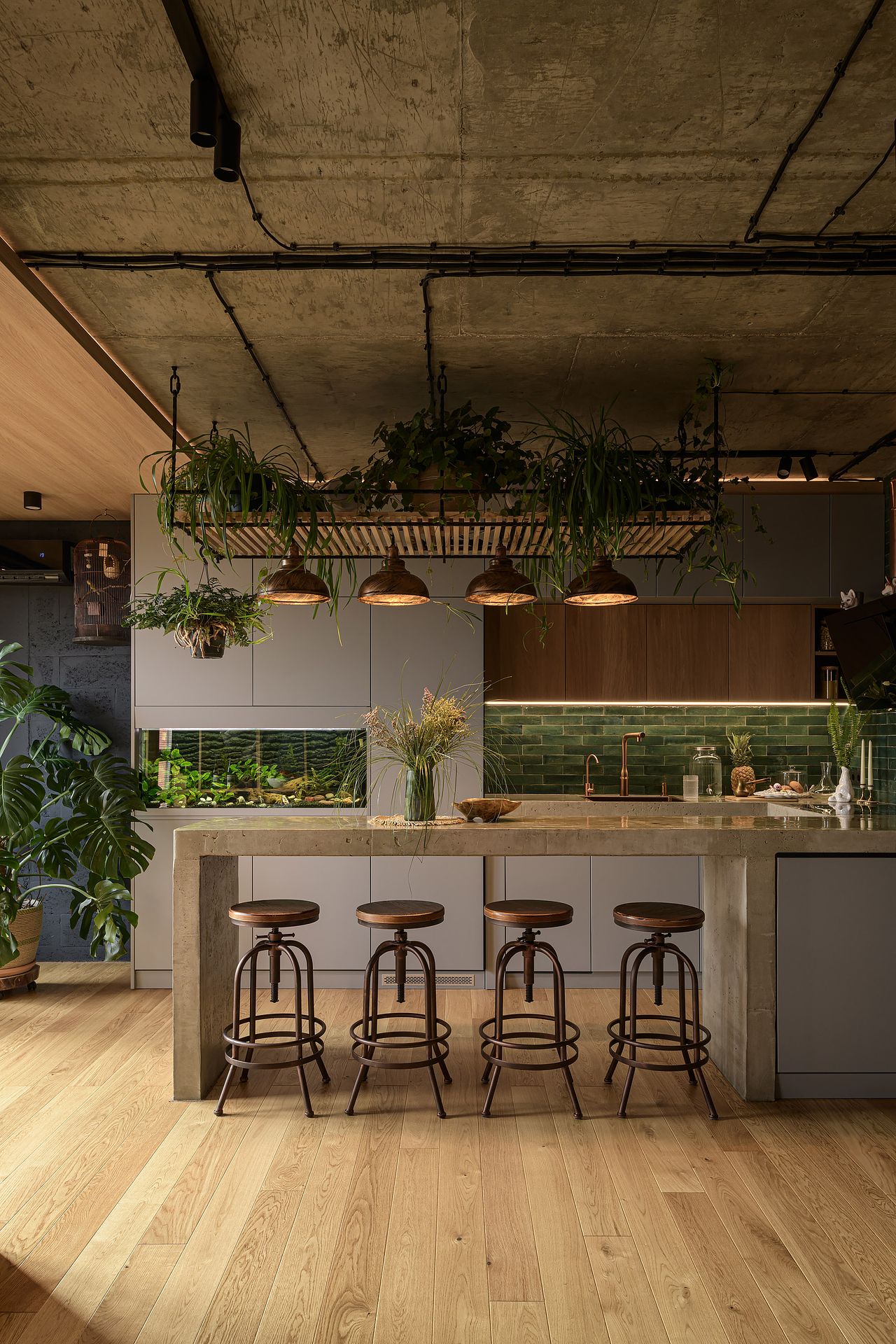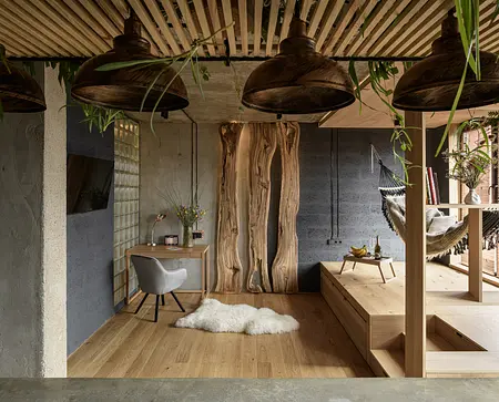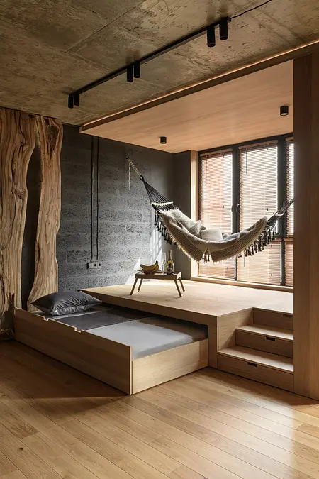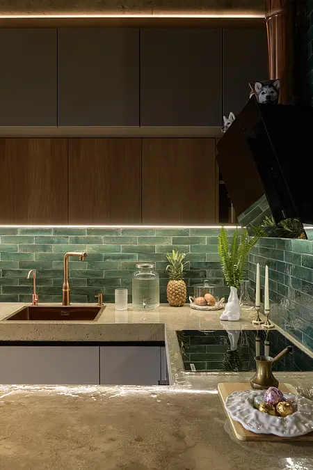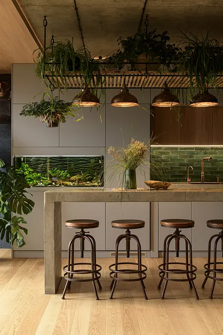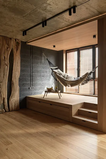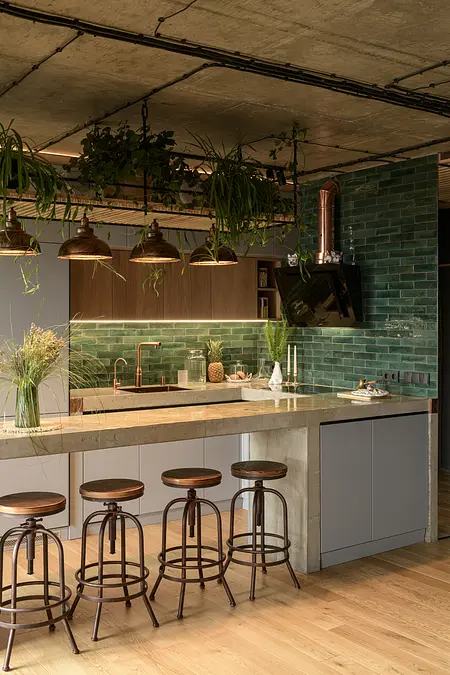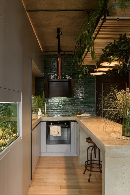 Minimalistyczna kuchnia z wyrazistymi akcentami, takimi jak zielone płytki, oraz komfortowa strefa wypoczynku z wiszącym hamakiem sprawiają, że mieszkanie jest zarówno stylowe, jak i funkcjonalne.
