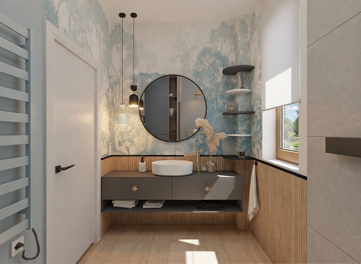 Łazienka z niebieskimi akcentami i drewnianymi detalami