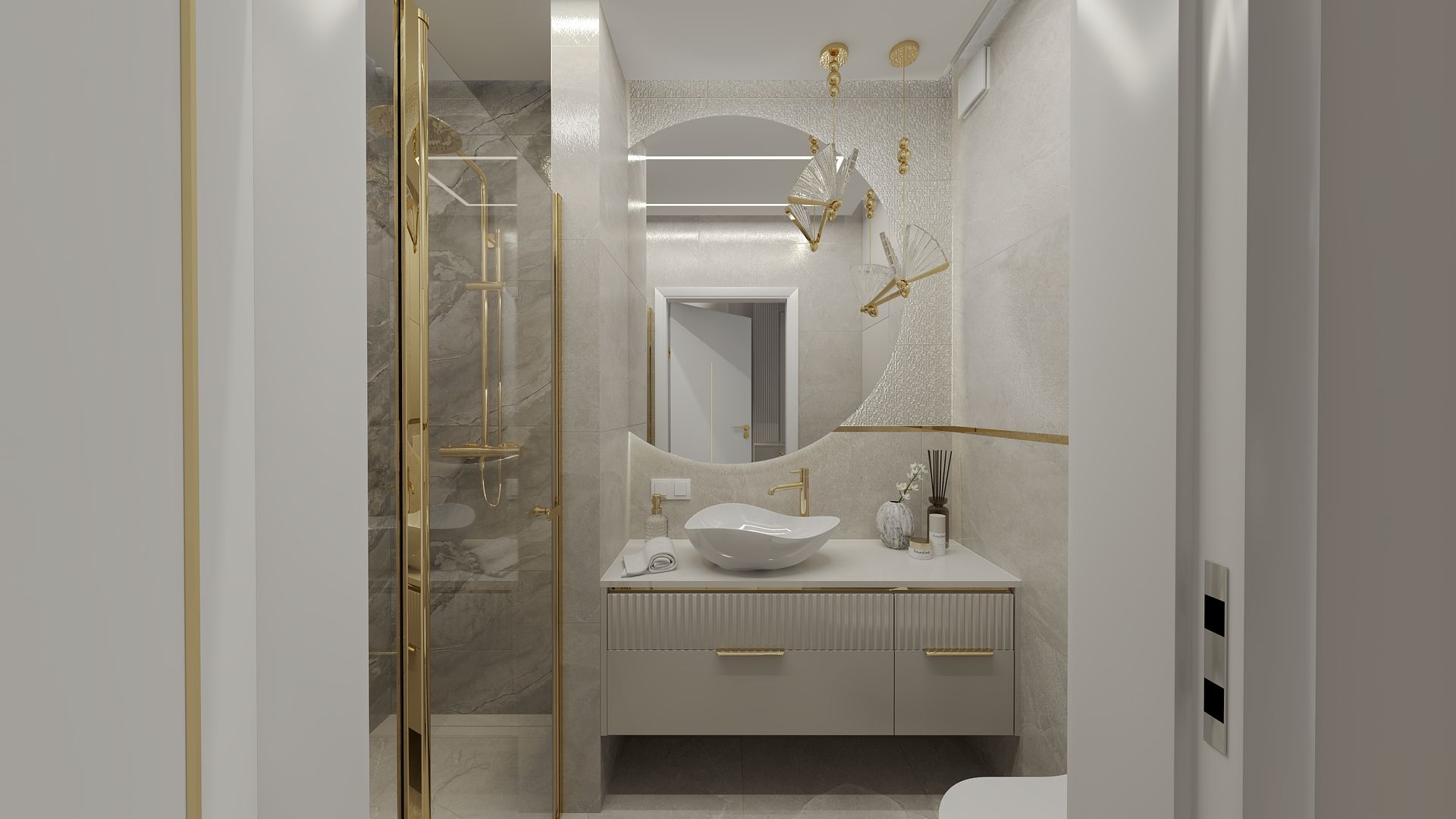 Łazienka z białą umywalką i złotymi akcentami