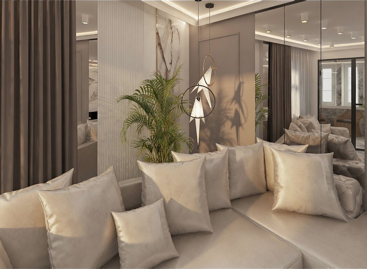 Wnętrze salonu z szarymi meblami i beżowymi dodatkami
