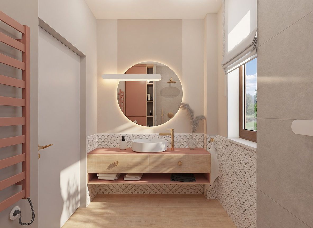 Łazienka z różowym blatem i okrągłym lustrem