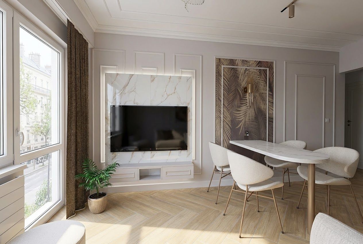 Wnętrze z telewizorem i jasnym stołem