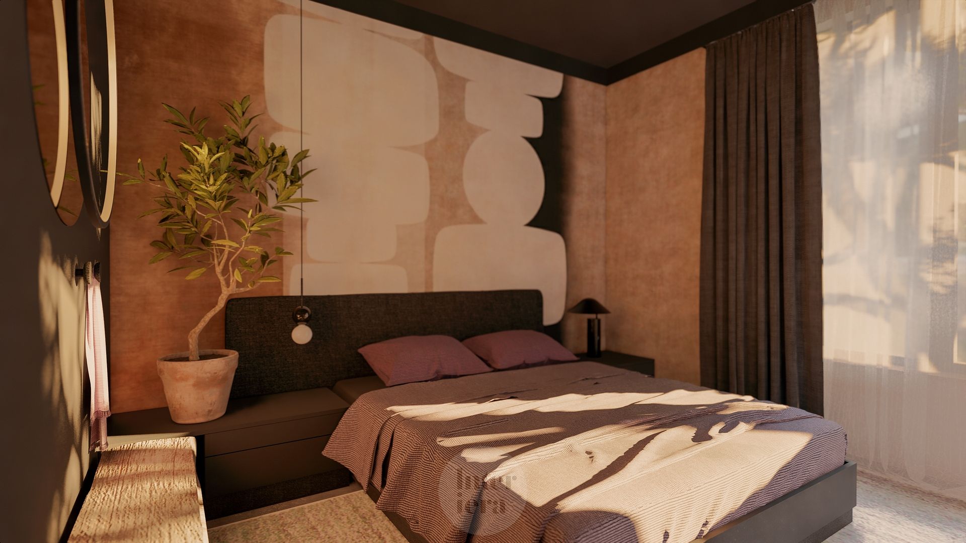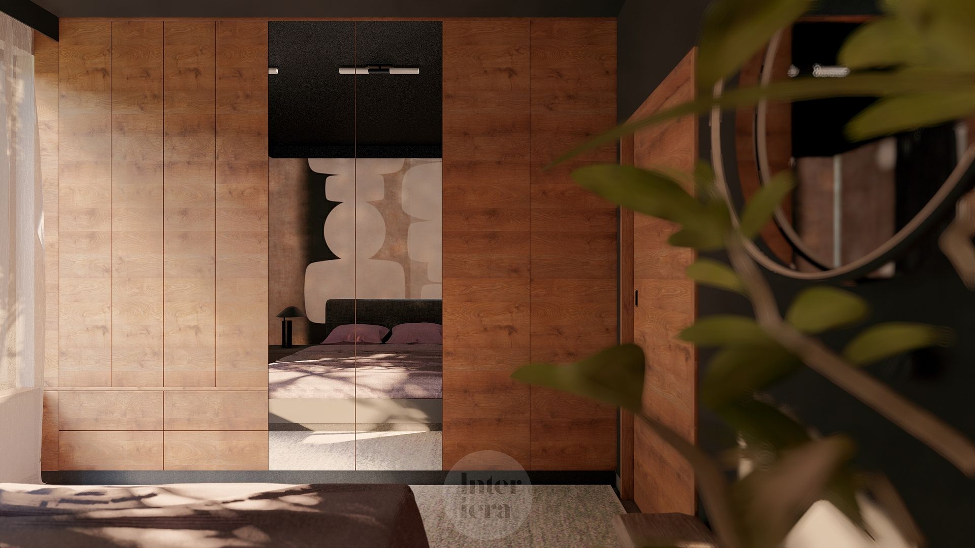 Sypialnia z drewnianymi akcentami i roślinnością