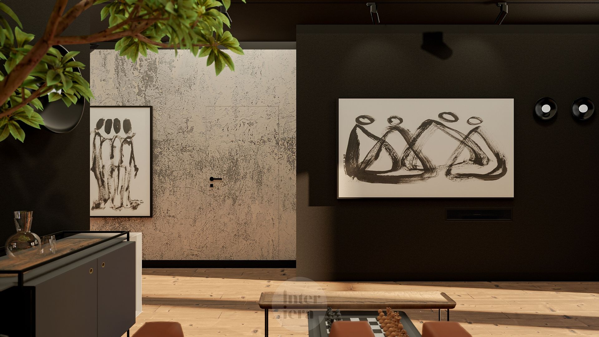 Wnętrze salonu z obrazami na ciemnych ścianach