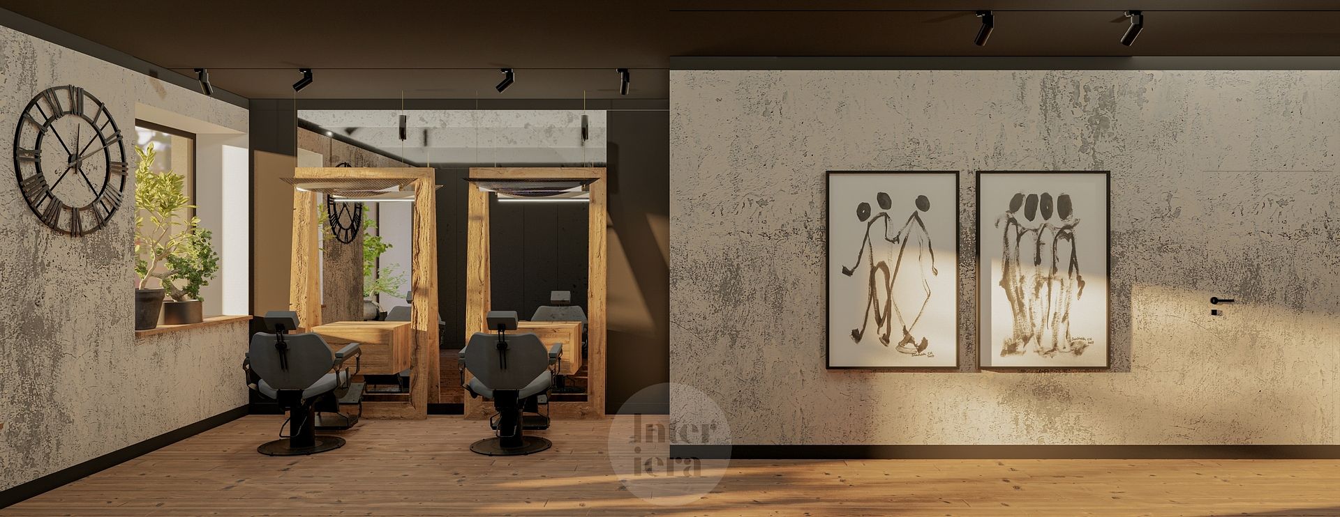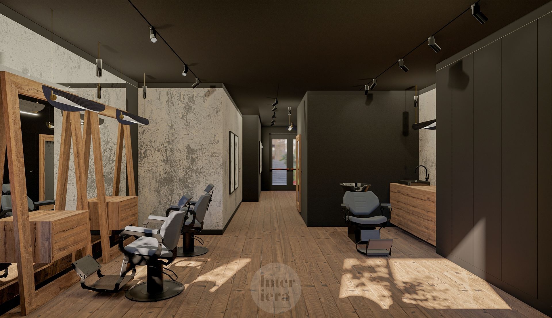 Wnętrze salonu fryzjerskiego z drewnianymi akcentami