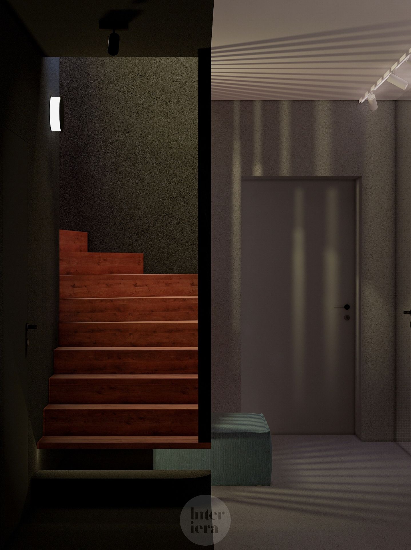 Korytarz z drewnianymi schodami i szarymi ścianami