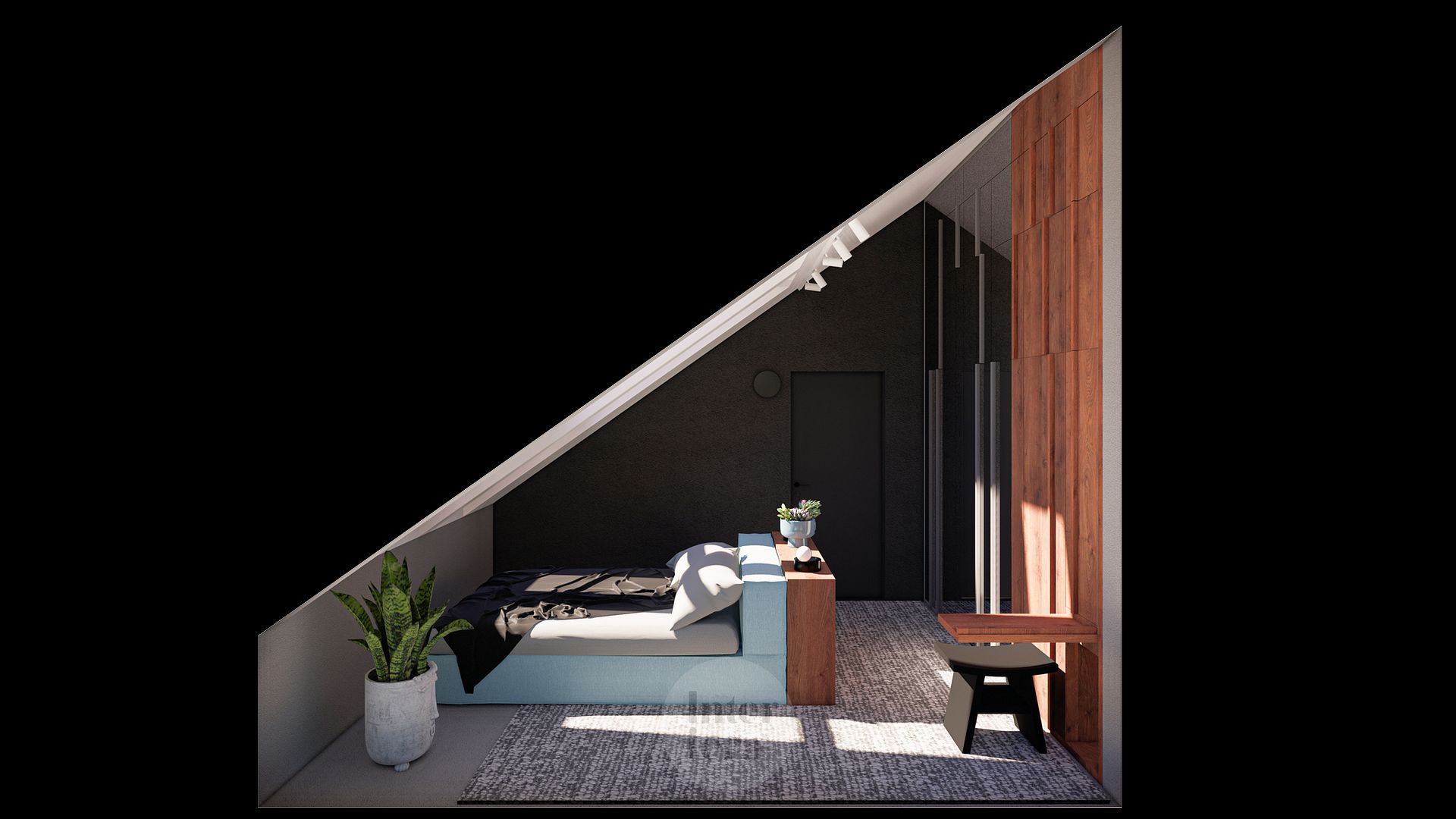 Sypialnia z drewnianą ścianą i okrągłym lustrem