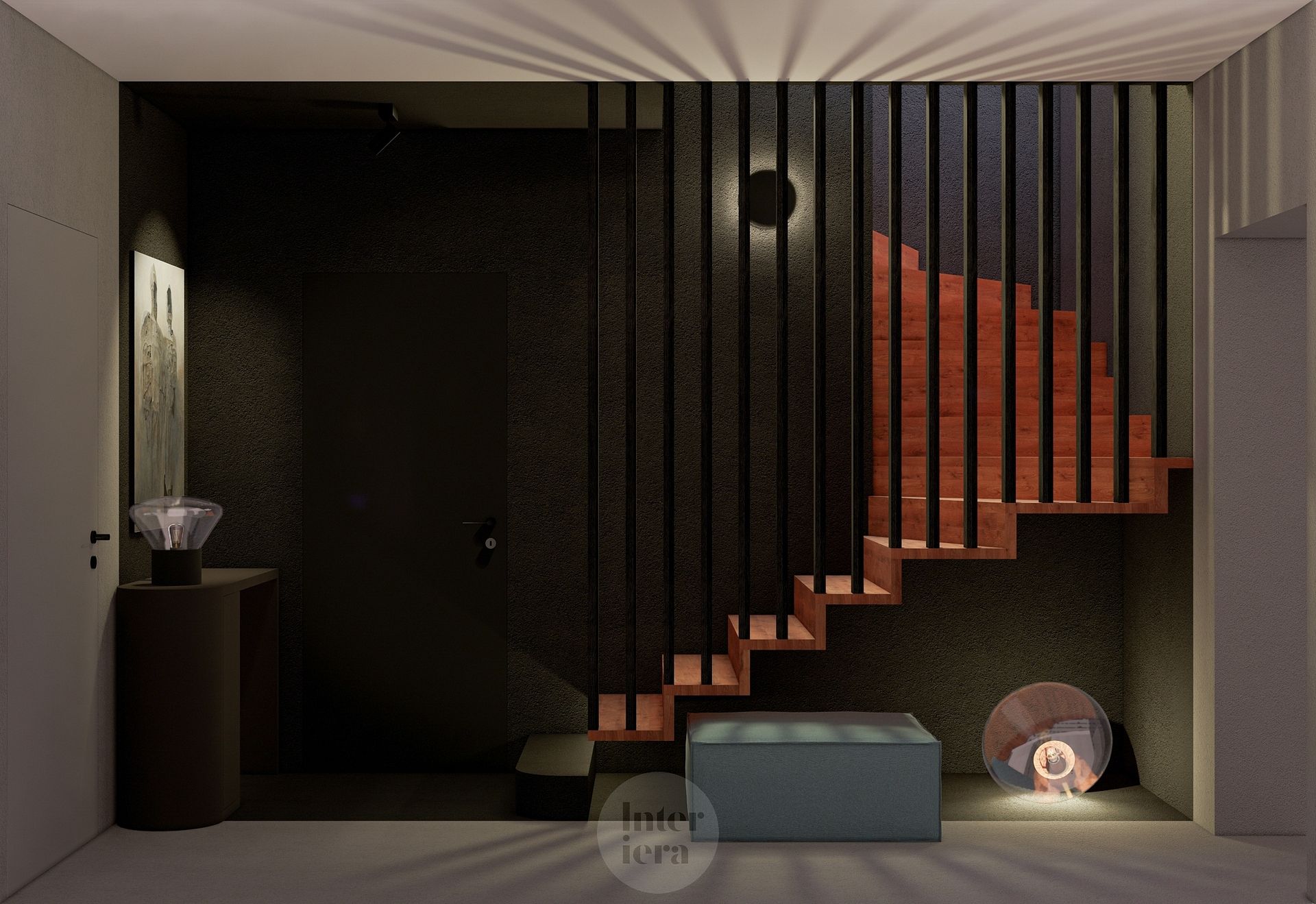 Przedpokój z drewnianymi schodami i lampą