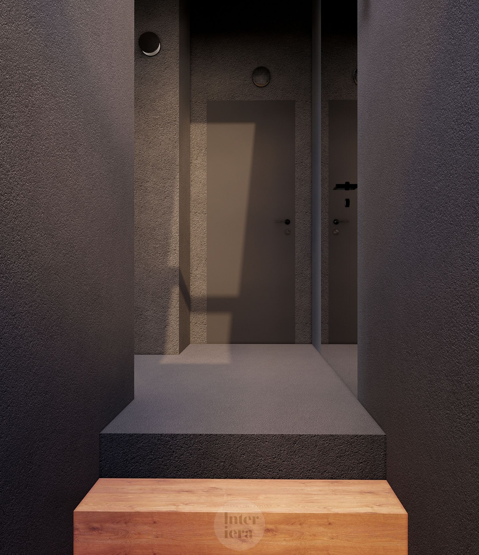 Przedpokój z szarymi ścianami i drewnianym podestem