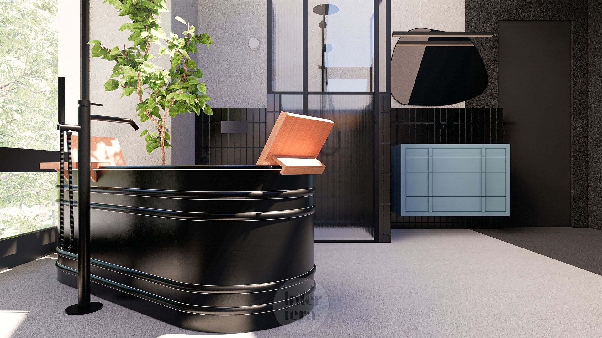 Łazienka z czarną wanną i niebieską szafką