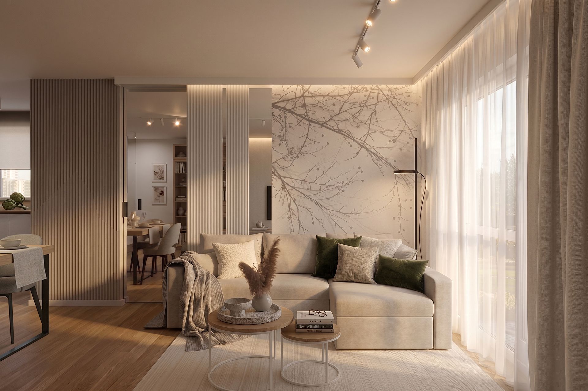 Salon z beżową sofą i drewnianym stołem